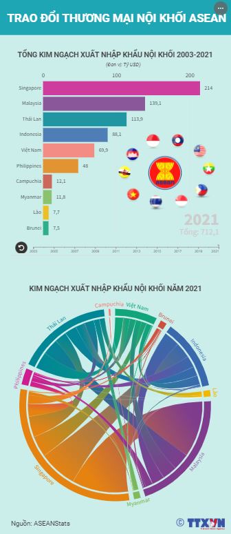 Trong nhiều năm qua, trao đổi thương mại giữa các nước ASEAN đã liên tục tăng trưởng. Thương mại nội khối ASEAN tăng từ 502,9 tỷ USD năm 2010 lên 712 tỷ USD năm 2021, chiếm khoảng 21,3% tổng thương mại của khối. Thị phần của ASEAN trong thương mại thế giới tăng từ khoảng 6,5% năm 2010 lên 7,5% vào năm 2021, nhanh hơn các khu vực khác và phản ánh bản chất hướng ngoại của hội nhập ASEAN.
