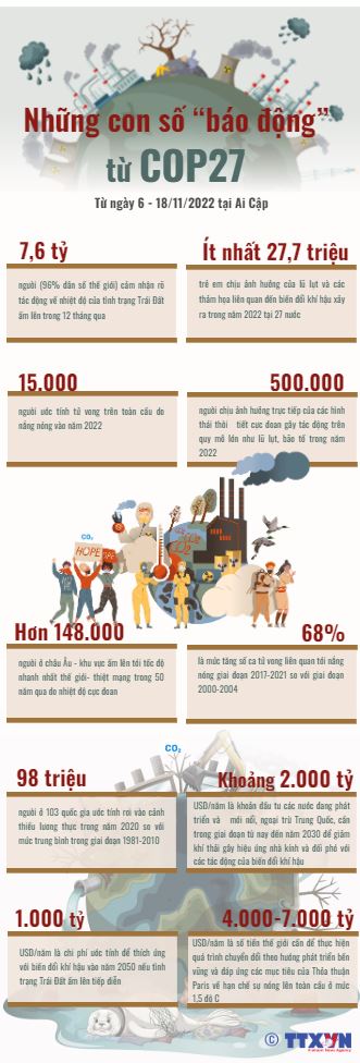 Hội nghị lần thứ 27 Các bên tham gia Công ước khung của Liên hợp quốc về biến đổi khí hậu (COP27), diễn ra từ ngày 6-18/11/2022 tại thành phố Sharm El-Sheikh của Ai Cập, đã đưa ra nhiều số liệu đáng báo động về tình trạng biến đổi khí hậu trên toàn cầu. COP27 diễn ra trong bối cảnh thế giới đang cùng lúc chứng kiến nhiều cuộc khủng hoảng từ đói nghèo, giá năng lượng và chi phí sinh hoạt tăng vọt. Thực trạng này càng trở nên trầm trọng hơn do ảnh hưởng của các hình thái thời tiết cực đoan.