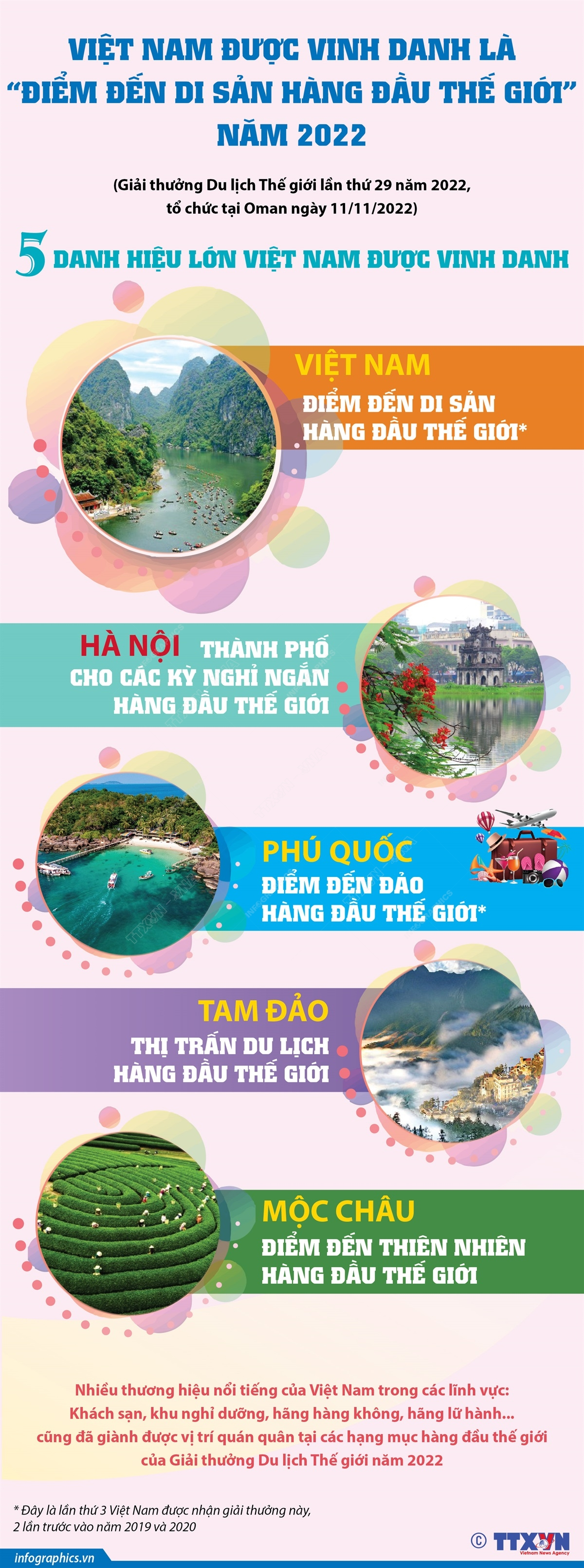 Theo thông tin từ Bộ Văn hóa, Thể thao và Du lịch, Giải thưởng Du lịch thế giới (World Travel Awards) vừa công bố danh sách giải thưởng cấp thế giới năm 2022. Việt Nam vinh dự được xướng tên ở 16 hạng mục giải thưởng, trong đó có 5 danh hiệu lớn. Cụ thể, Hà Nội được trao giải Thành phố hàng đầu thế giới cho các kỳ nghỉ ngắn, Phú Quốc được giải Điểm đến đảo hàng đầu thế giới, Tam Đảo là Thị trấn du lịch hàng đầu thế giới, Mộc Châu là điểm đến thiên nhiên hàng đầu thế giới và cuối cùng Việt Nam đoạt giải Điểm đến di sản hàng đầu thế giới năm 2022. Các giải thưởng Việt Nam đạt được một lần nữa cho thấy sự yêu mến, công nhận và tôn vinh của cộng đồng quốc tế đối với sức hấp dẫn của du lịch Việt Nam.