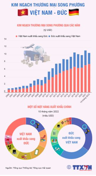 Những năm qua, quan hệ thương mại giữa Việt Nam và Đức liên tục phát triển và đạt được nhiều thành tựu đáng ghi nhận. Tổng kim ngạch 2 chiều giữa 2 nước năm 2021 đạt trên 11,2 tỷ; 10 tháng năm 2022 đạt gần 10,6 tỷ USD, trong đó Việt Nam xuất khẩu sang Đức 7,6 tỷ USD, nhập khẩu từ Đức 3 tỷ USD. Với đặc thù cơ cấu hàng hóa bổ sung cho nhau là chủ yếu, ít cạnh tranh trực tiếp, thương mại 2 nước được kỳ vọng sẽ tiếp tục đà tăng trưởng mạnh mẽ trong tương lai.