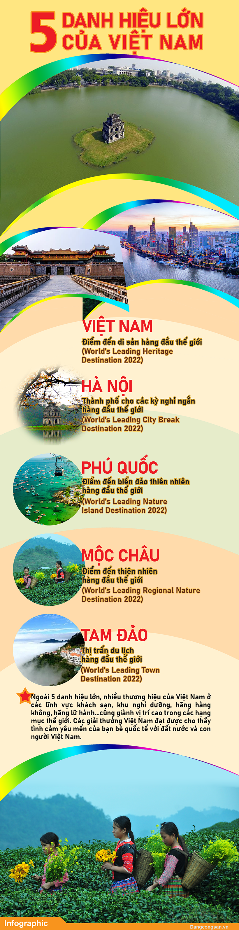 Giải thưởng Oscar du lịch thế giới - World Travel Awards 2022 (WTA) vừa tổ chức tại Muscat – Oman, đã vinh danh Việt Nam trong 16 hạng mục giải thưởng hàng đầu thế giới với 5 danh hiệu lớn. Đây là lần thứ 3, Việt Nam đạt danh hiệu này, 2 lần trước vào năm 2019 và 2020.
