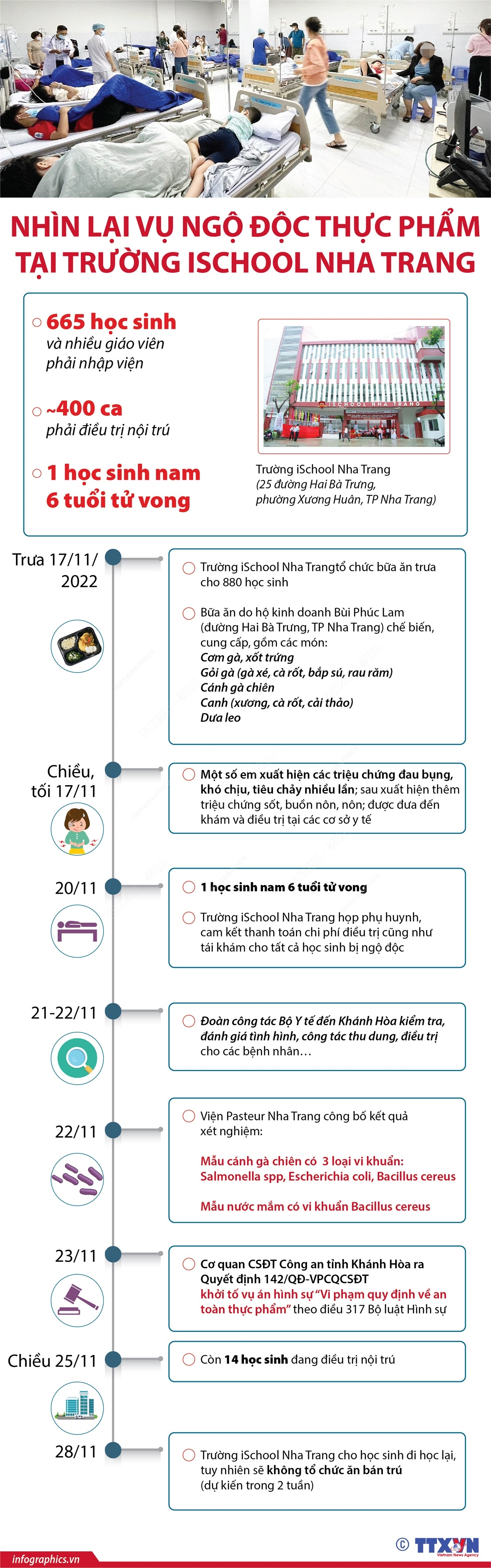 Đã có hơn 600 học sinh và nhiều giáo viên bị ngộ độc thực phẩm sau bữa ăn trưa ngày 17/11/2022 tại Trường iSchool Nha Trang (25 đường Hai Bà Trưng, phường Xương Huân, TP Nha Trang), một học sinh 6 tuổi đã tử vong. Đây được coi là vụ ngộ độc thực phẩm lớn nhất trong khối học đường. Dưới đây là diễn biến vụ việc