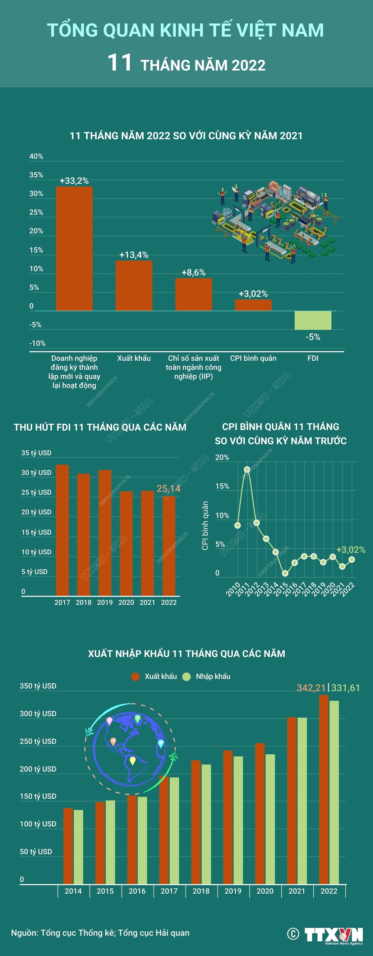Bình quân 11 tháng năm 2022, CPI tăng 3,02% so với cùng kỳ năm trước, chủ yếu do giá lương thực và giá xăng dầu. Tính chung 11 tháng năm 2022, cán cân thương mại hàng hóa ước tính xuất siêu 10,6 tỷ USD (cùng kỳ năm 2021 xuất siêu 0,6 tỷ USD) cả nước có 194,7 nghìn doanh nghiệp đăng ký thành lập mới và quay trở lại hoạt động, tăng 33,2% so với cùng kỳ năm trước. Tổng vốn đầu tư trực tiếp nước ngoài (FDI) đăng ký vào Việt Nam đạt gần 25,14 tỷ USD, giảm 5% so với 11 tháng năm 2021.