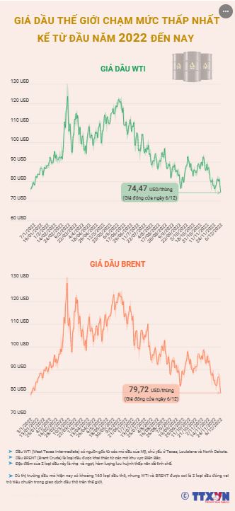 Chốt phiên giao dịch ngày 6/12/2022, giá dầu thế giới chạm mức thấp nhất kể từ đầu năm 2022 đến nay, khi các nhà đầu tư rời khỏi thị trường đầy biến động trong bối cảnh kinh tế nhiều bất ổn.