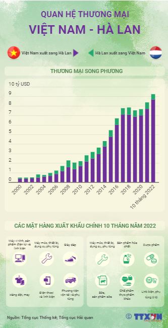 Trong thời gian qua, quan hệ thương mại giữa Việt Nam và Hà Lan đạt nhiều kết quả tích cực và còn nhiều không gian để phát triển. Hà Lan là thị trường xuất khẩu lớn thứ hai của Việt Nam tại châu Âu. Trong 10 tháng năm 2022, Việt Nam xuất khẩu sang Hà Lan 8,68 tỷ USD, nhập khẩu 549 triệu USD. Tổng kim ngạch thương mại hai chiều đạt 9,23 tỷ USD, cao hơn 10% so với cả năm 2021.