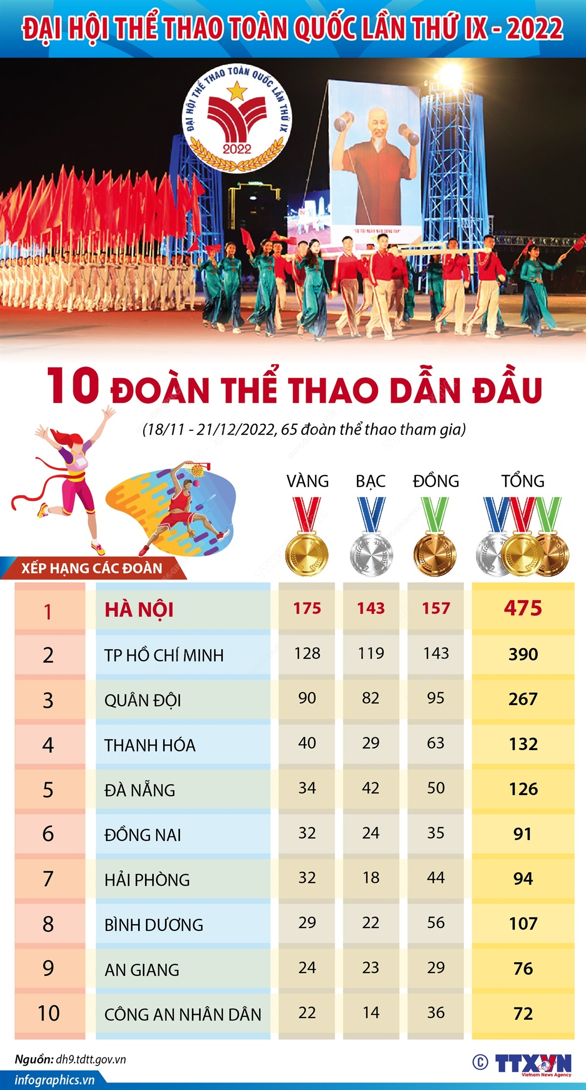 Đại hội Thể thao toàn quốc 2022 đã khép lại với những dấu ấn tích cực về chuyên môn cũng như công tác tổ chức. Trong đó, 53 kỷ lục mới quốc gia và 96 kỷ lục mới tại Đại hội được xác lập. Đoàn thể thao thành phố Hà Nội xuất sắc đứng đầu bảng tổng sắp huy chương với tổng cộng 475 huy chương.