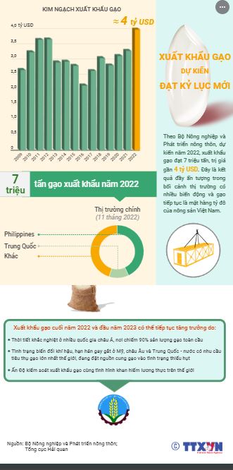 Theo Bộ Nông nghiệp và Phát triển nông thôn, dự kiến năm 2022, xuất khẩu gạo của Việt Nam đạt 7 triệu tấn, trị giá gần 4 tỷ USD. Đây là kết quả ấn tượng trong bối cảnh thị trường thế giới có nhiều biến động và gạo tiếp tục là mặt hàng xuất khẩu tỷ đô của nông sản Việt Nam.