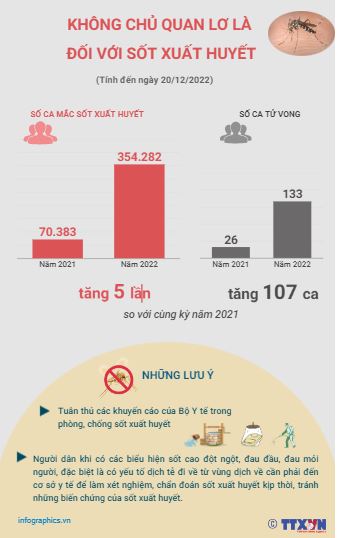 Từ đầu năm 2022 đến nay, cả nước ghi nhận hơn 354.280 trường hợp mắc, 133 ca tử vong do sốt xuất huyết. So với cùng kỳ năm 2021, số ca mắc tăng 5 lần, tử vong tăng 107 trường hợp. Thời gian qua, số ca mắc sốt xuất huyết có giảm, tuy nhiên các chuyên gia vẫn cảnh báo người dân không được không chủ quan, lơ là với sốt xuất huyết.