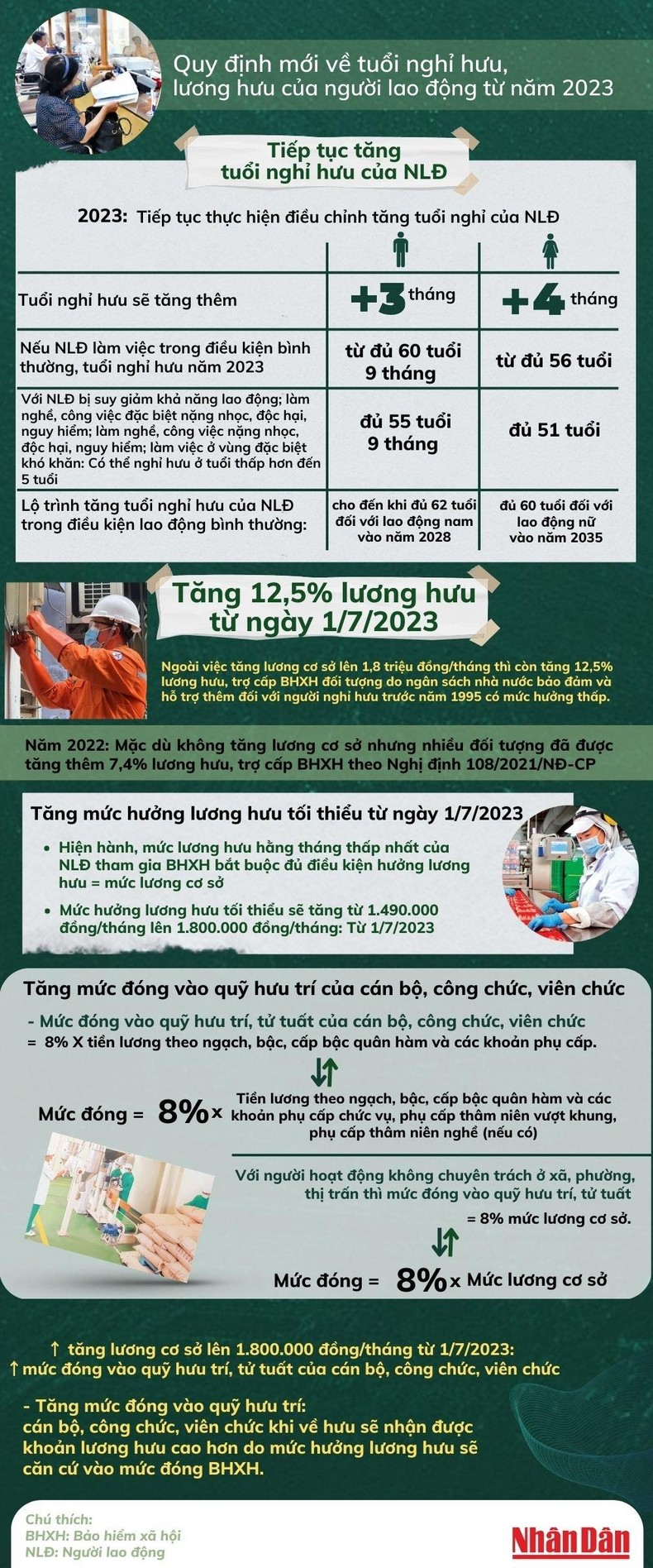 Từ năm 2023, tiếp tục thực hiện điều chỉnh tăng tuổi nghỉ hưu của người lao động, thêm 3 tháng với nam và 4 tháng với nữ. Chính sách lương hưu, mức đóng vào quỹ hưu trí với cán bộ, công chức, viên chức cũng có một số thay đổi.