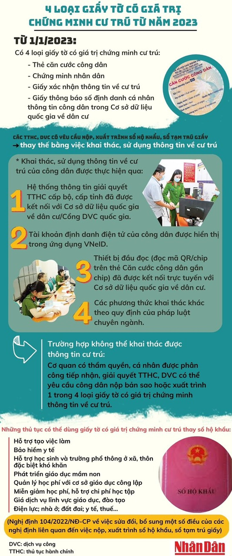 Từ ngày 1/1/2023, người dân có thể dùng một trong bốn loại giấy tờ có giá trị chứng minh cư trú để làm một số thủ tục hành chính, dịch vụ công. Đó là: thẻ căn cước công dân, chứng minh nhân dân, giấy xác nhận thông tin về cư trú, giấy thông báo số định danh cá nhân thông tin công dân trong Cơ sở dữ liệu quốc gia về dân cư.
