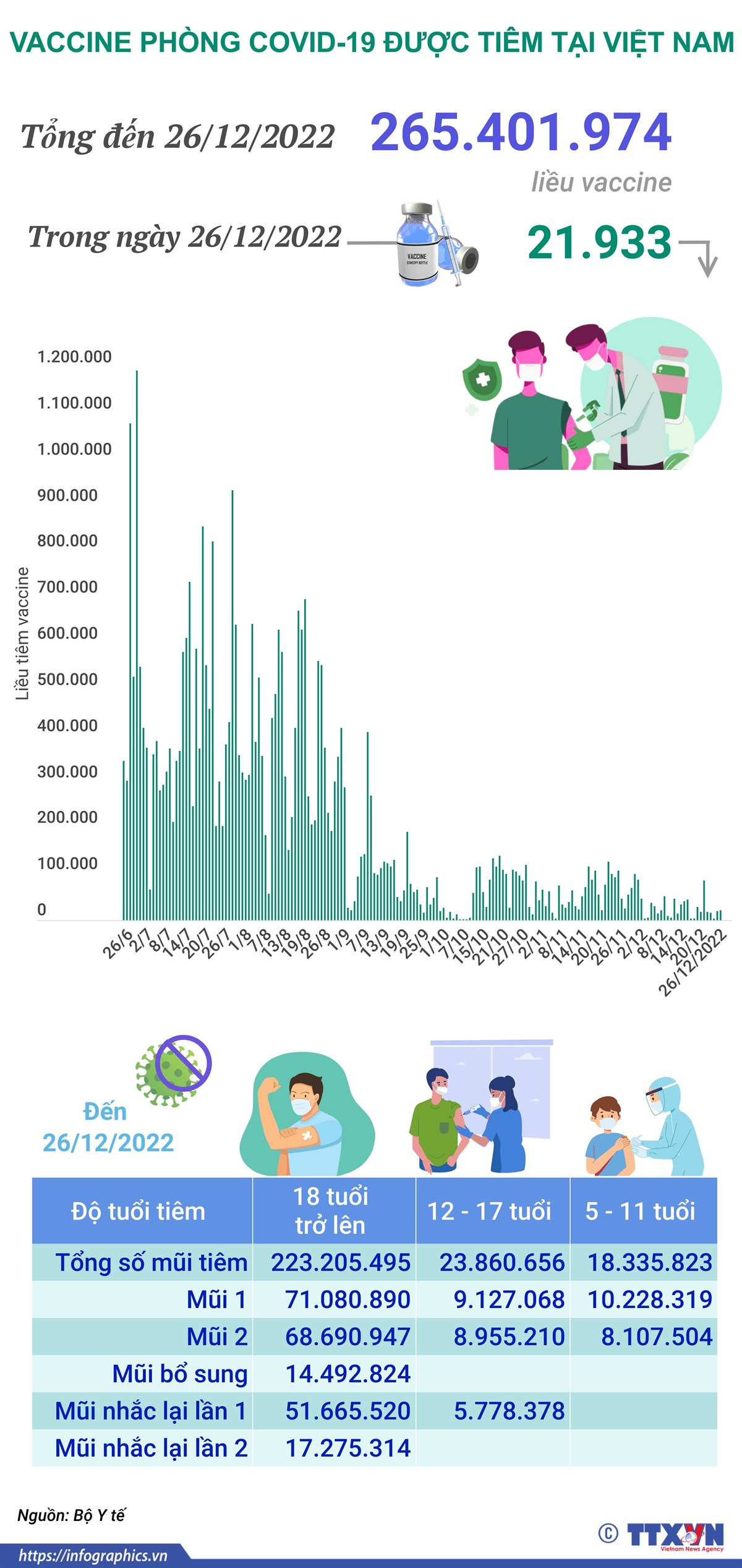 Trong ngày 26/12/2022 có 21.933 liều vaccine phòng COVID-19 được tiêm. Như vậy, tổng số liều vaccine đã được tiêm tại Việt Nam là 265.401.974 liều trong đó tiêm cho trẻ từ 5-11 tuổi là 18.335.823 liều, tiêm cho trẻ từ 12-17 tuổi là 23.860.656 liều và tiêm cho người từ 18 tuổi trở lên là 223.205.495 liều.