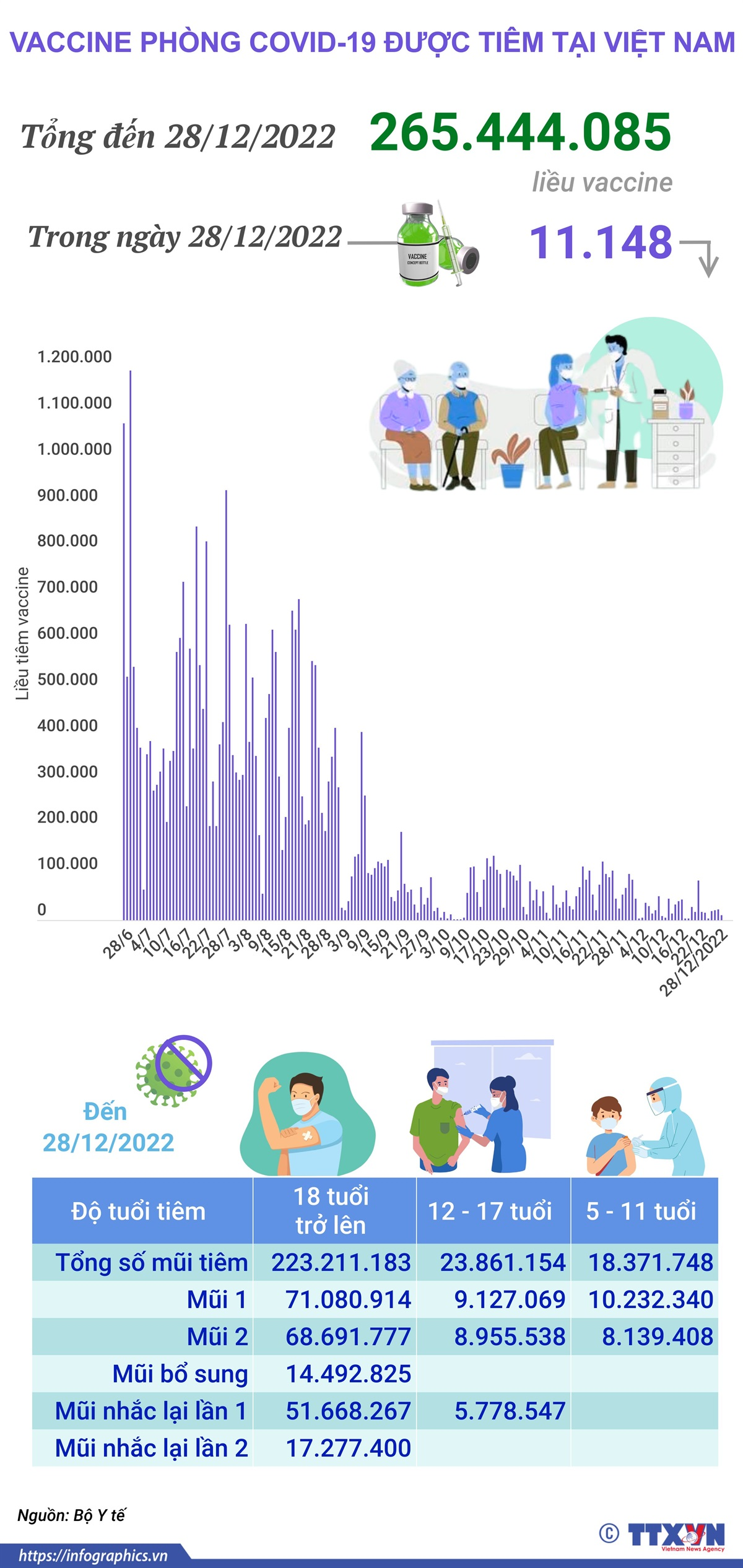 Trong ngày 28/12/2022 có 11.148 liều vaccine phòng COVID-19 được tiêm. Như vậy, tổng số liều vaccine đã được tiêm tại Việt Nam là 265.444.085 liều trong đó tiêm cho trẻ từ 5-11 tuổi là 18.371.748 liều, tiêm cho trẻ từ 12-17 tuổi là 23.861.154 liều và tiêm cho người từ 18 tuổi trở lên là 223.211.183 liều.