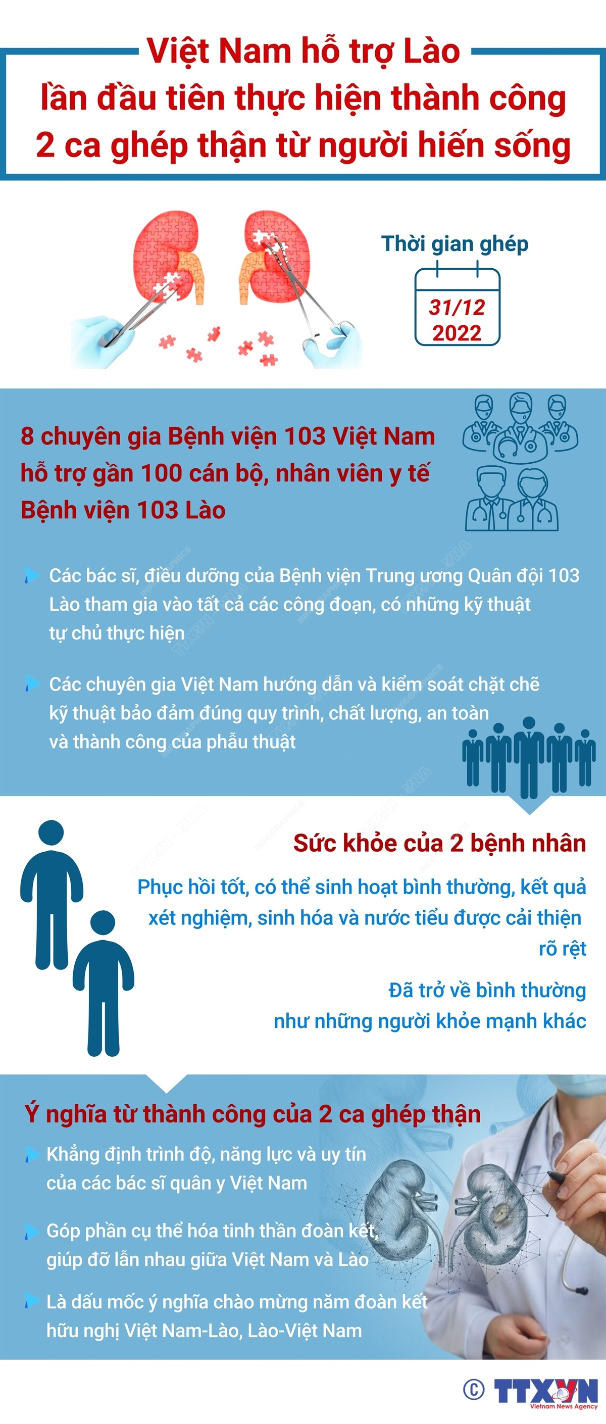 Ngày 31/12/2022 vừa qua đã đánh dấu mốc việc lần đầu tiên thực hiện ghép thận từ người hiến sống tại Lào. Gần 100 cán bộ, nhân viên y tế của Bệnh viện 103 Lào với sự hỗ trợ của 8 chuyên gia của Bệnh viện 103 Việt Nam đã thực hiện thành công ghép thận từ người hiến sống ở 2 trường hợp. Các bác sĩ, điều dưỡng của Bệnh viện Trung ương Quân đội 103 Lào đã tham gia vào tất cả các công đoạn, có những kỹ thuật tự chủ thực hiện. Các chuyên gia Việt Nam hướng dẫn và kiểm soát chặt chẽ kỹ thuật bảo đảm đúng quy trình, chất lượng, an toàn và thành công của phẫu thuật.