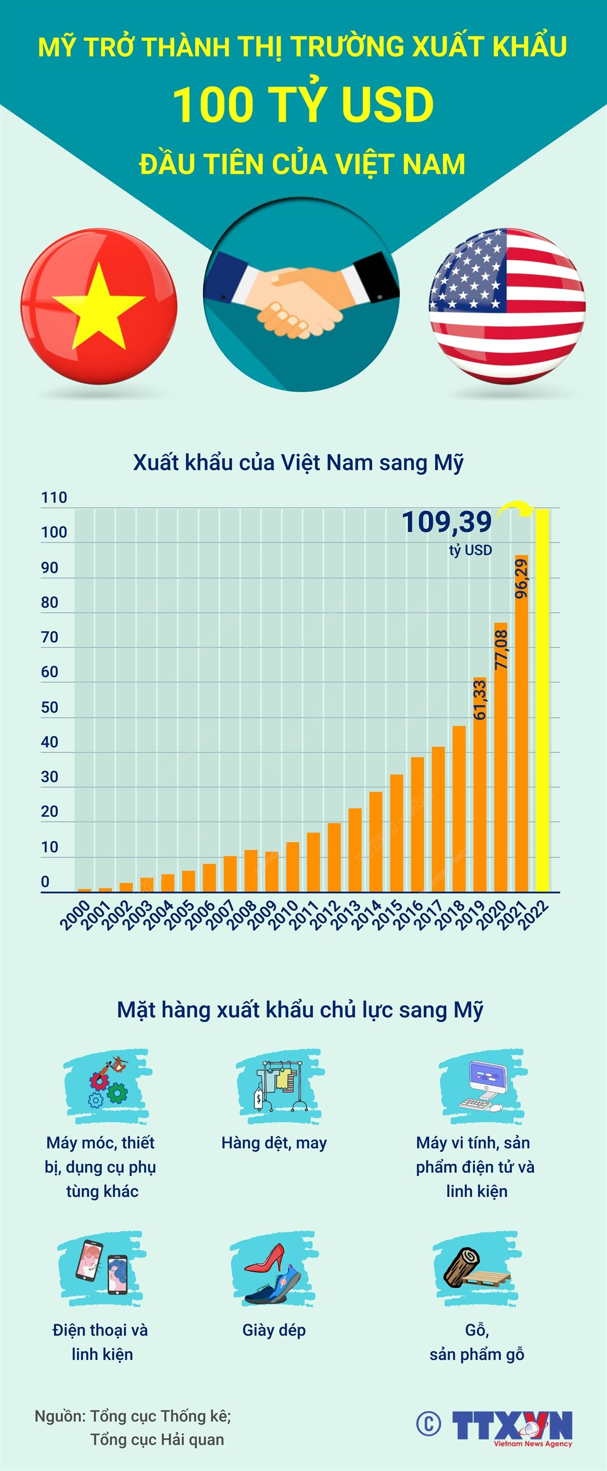 Năm 2022, Mỹ là thị trường xuất khẩu lớn nhất của Việt Nam với kim ngạch ước đạt 109,39 tỷ USD. Đây cũng là thị trường xuất khẩu đầu tiên từ trước đến nay vượt mốc 100 tỷ USD/năm.