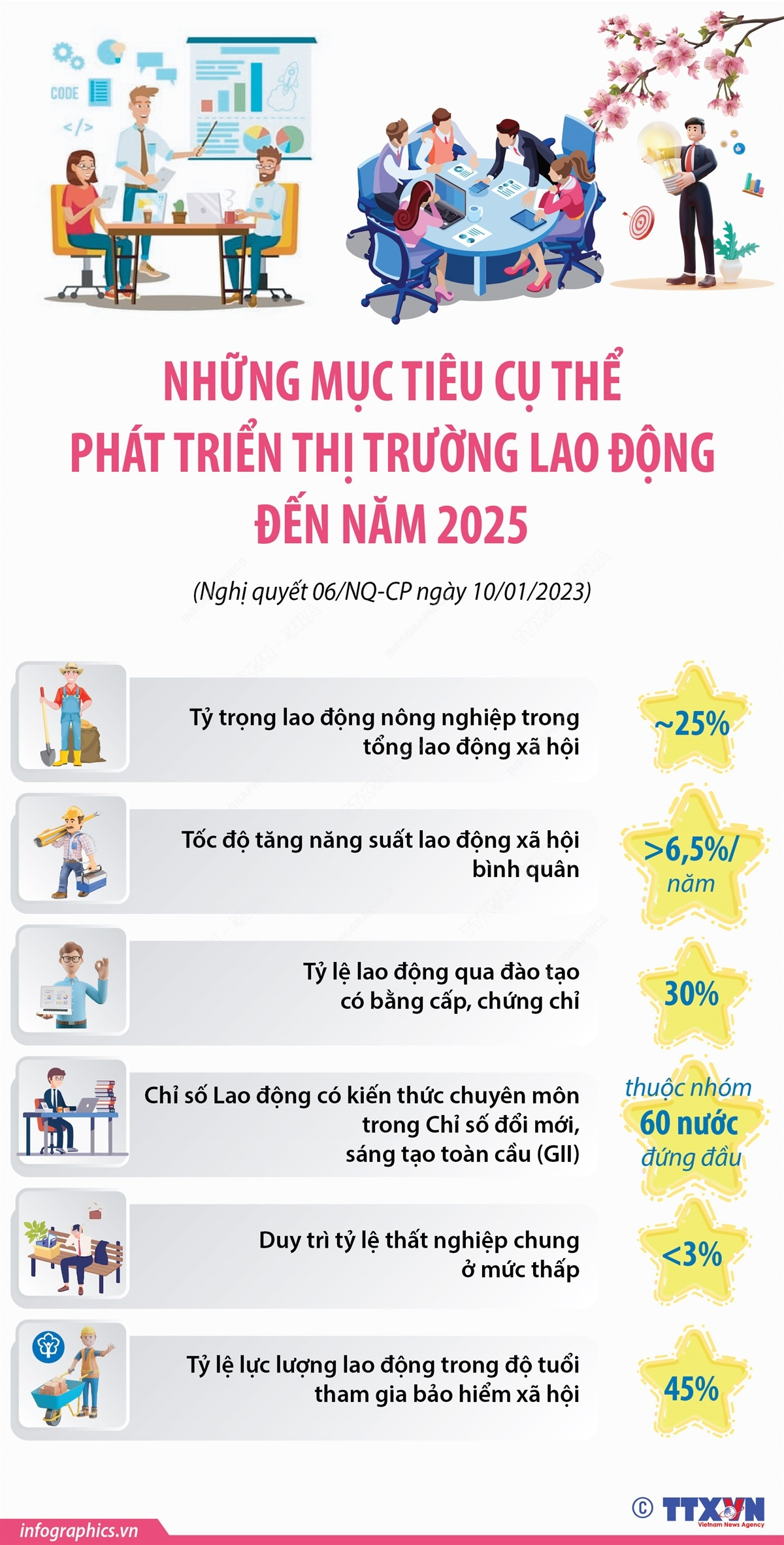 Chính phủ ban hành Nghị quyết 06/NQ-CP ngày 10/01/2023 về phát triển thị trường lao động linh hoạt, hiện đại, hiệu quả, bền vững và hội nhập nhằm phục hồi nhanh kinh tế - xã hội. Theo đó, mục tiêu cụ thể phát triển thị trường lao động phấn đấu đến năm 2025 như sau.