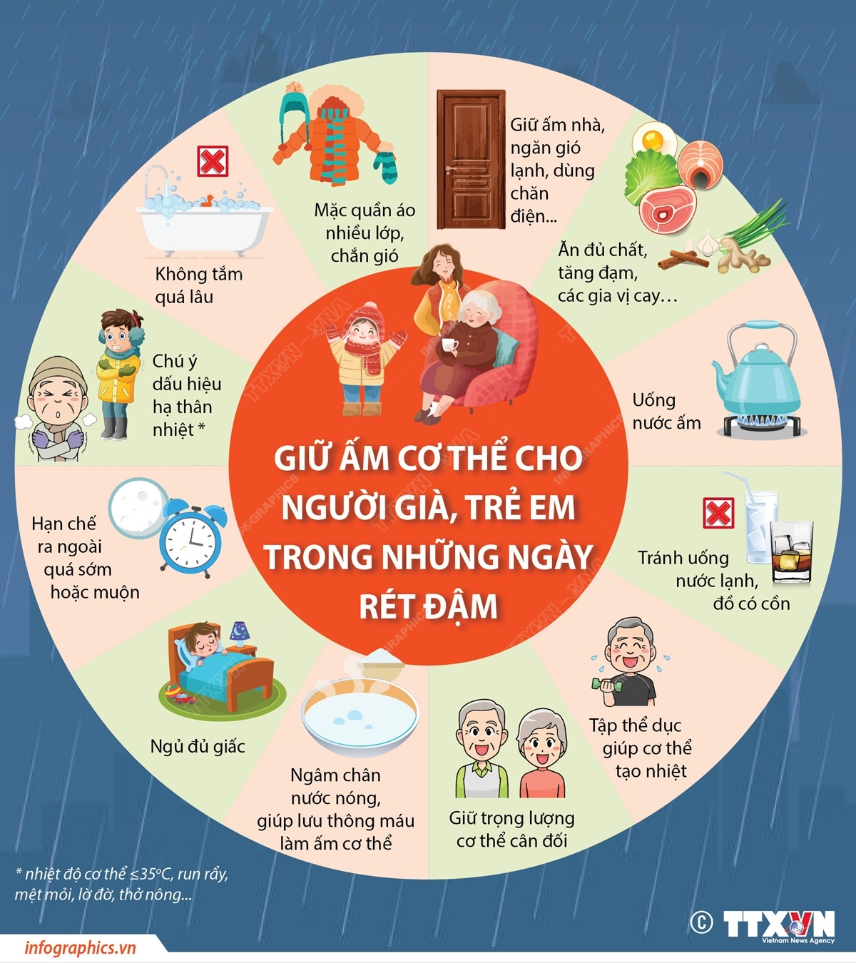Các tỉnh phía Bắc đang trong đợt rét đậm rét hại, có nơi nhiệt độ xuống dưới 10 độ C gây ảnh hưởng lớn đến sức khỏe, nhất là người già và trẻ em. Giữ cho cơ thể ấm áp trong những ngày rét đậm, rét hại sẽ phòng tránh được nhiều bệnh tật. Ăn uống đầy đủ, mặc nhiều lớp áo, không uống bia rượu... là những cách nên làm để giữ ấm khi trời lạnh.