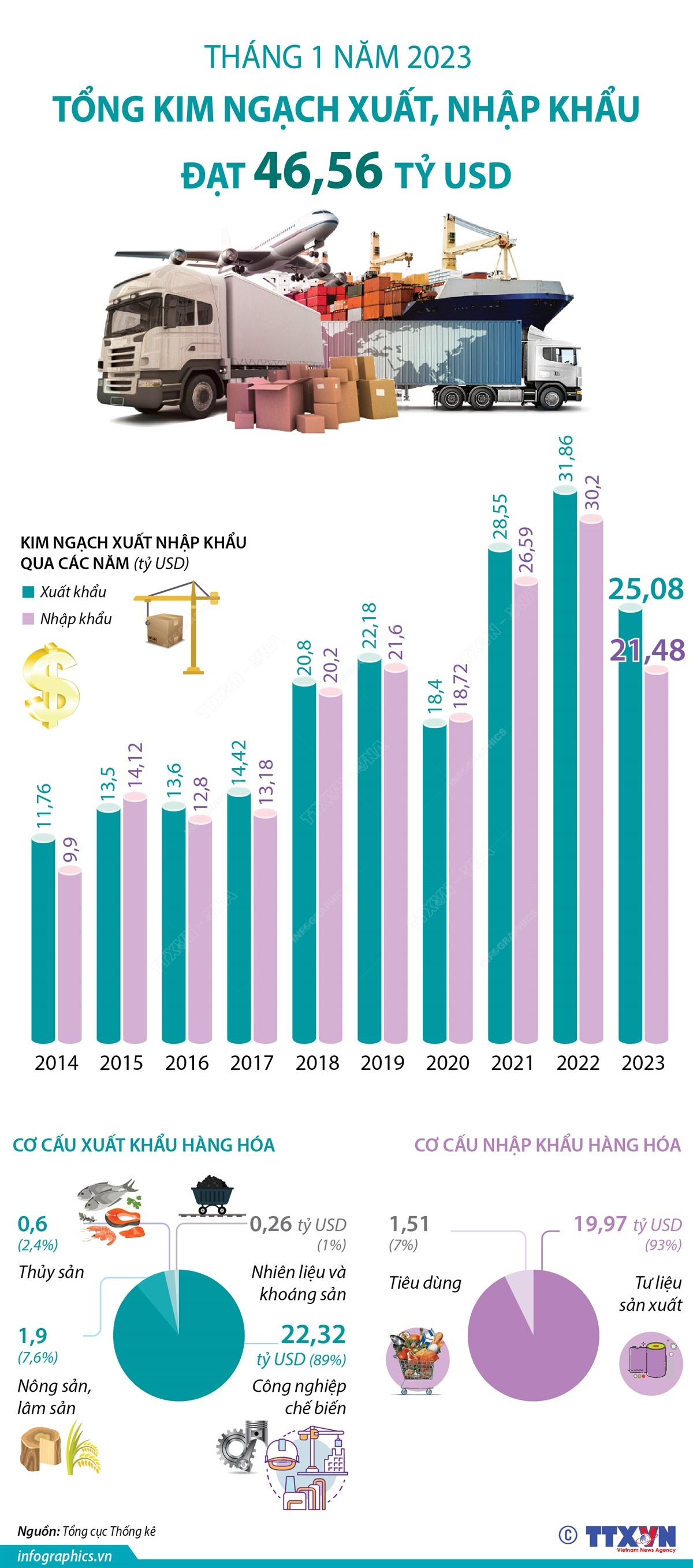 Tháng 1/2023, tổng kim ngạch xuất, nhập khẩu hàng hóa của cả nước ước đạt 46,56 tỷ USD, giảm 25% so với cùng kỳ năm 2022. Cán cân thương mại ước tính xuất siêu 3,6 tỷ USD.