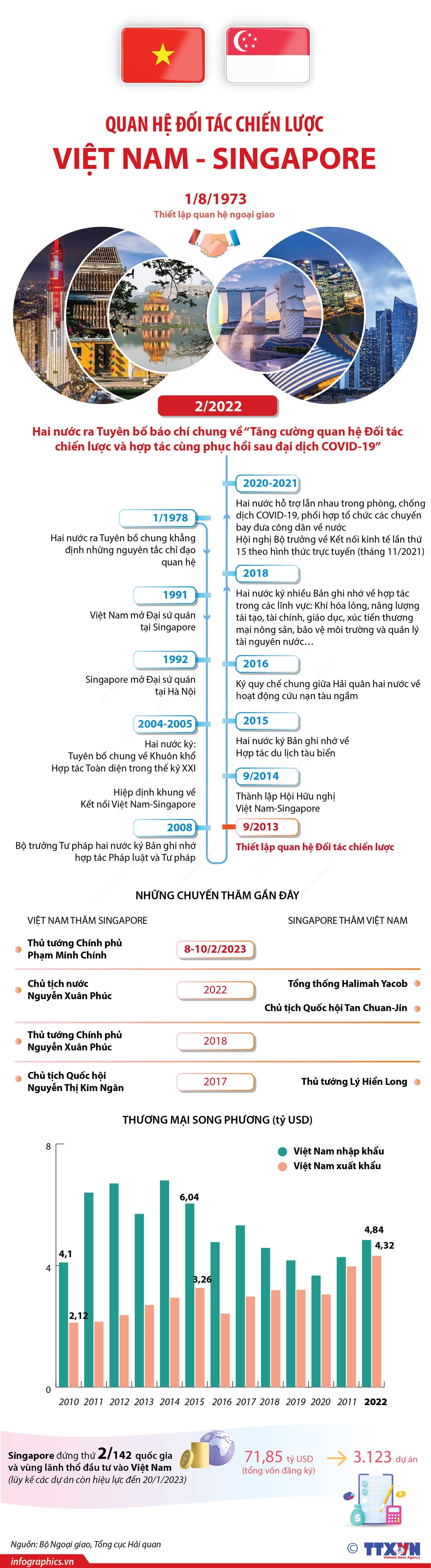 Nhận lời mời của Thủ tướng nước Cộng hòa Singapore Lý Hiển Long, Thủ tướng Chính phủ Phạm Minh Chính thăm chính thức nước Cộng hòa Singapore từ ngày 8 - 10/2/2023. Việt Nam và Singapore chính thức thiết lập quan hệ ngoại giao năm 1973 và nâng tầm quan hệ lên Đối tác chiến lược năm 2013. Năm 2023, hai nước cùng kỷ niệm 50 năm Ngày thiết lập quan hệ ngoại giao, 10 năm thiết lập quan hệ Đối tác chiến lược. Những năm qua, quan hệ giữa hai nước phát triển năng động, mạnh mẽ trên các lĩnh vực. Trao đổi đoàn, tiếp xúc cấp cao và các cấp được duy trì thường xuyên, hiệu quả. Singapore là đối tác kinh tế quan trọng hàng đầu của Việt Nam ở khu vực ASEAN.
