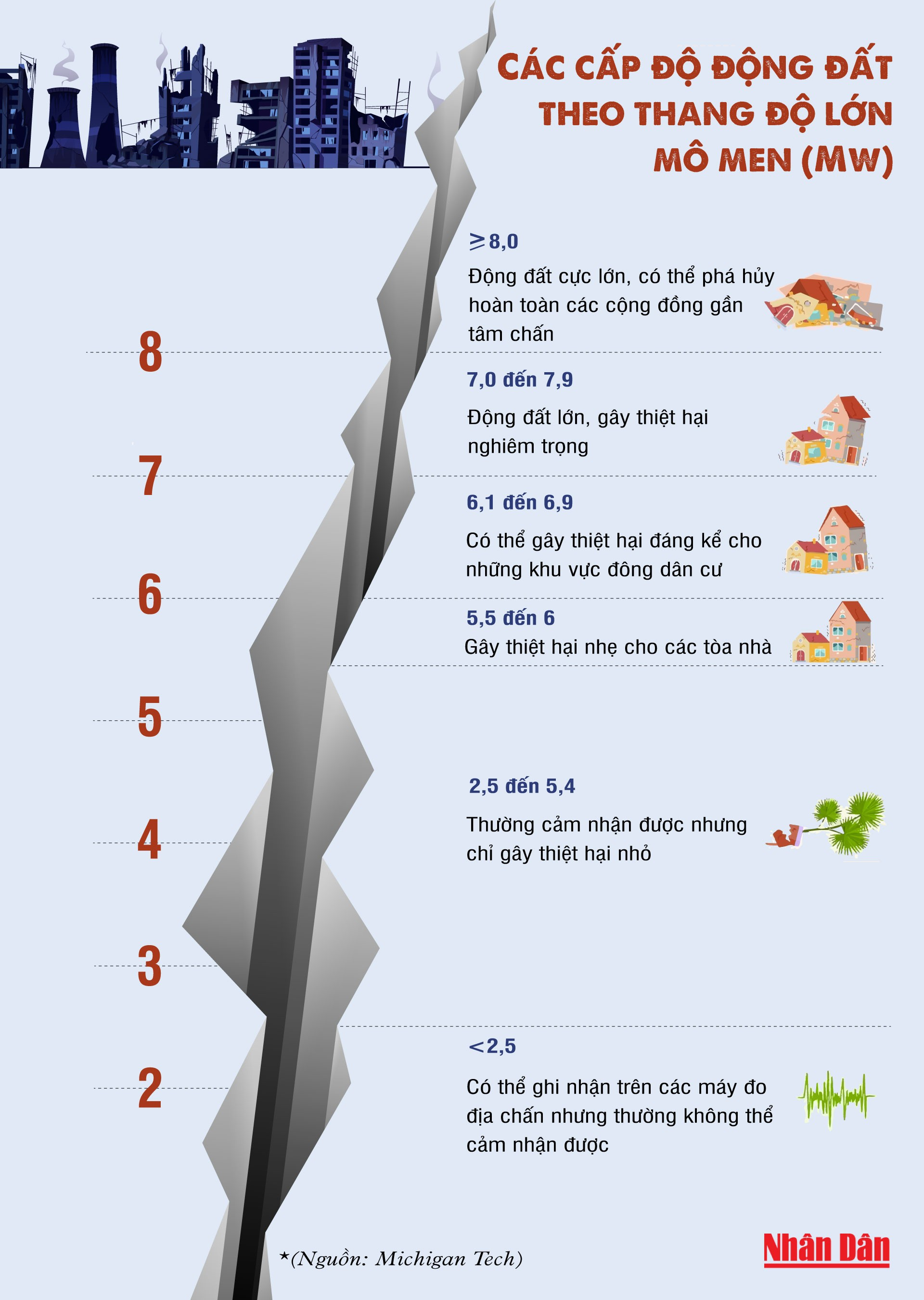 Trận động đất có độ lớn từ 2,5 trở xuống thường không thể cảm nhận được còn những trận động đất có độ lớn từ 8 trở lên có thể phá hủy hoàn toàn các cộng đồng gần tâm chấn.