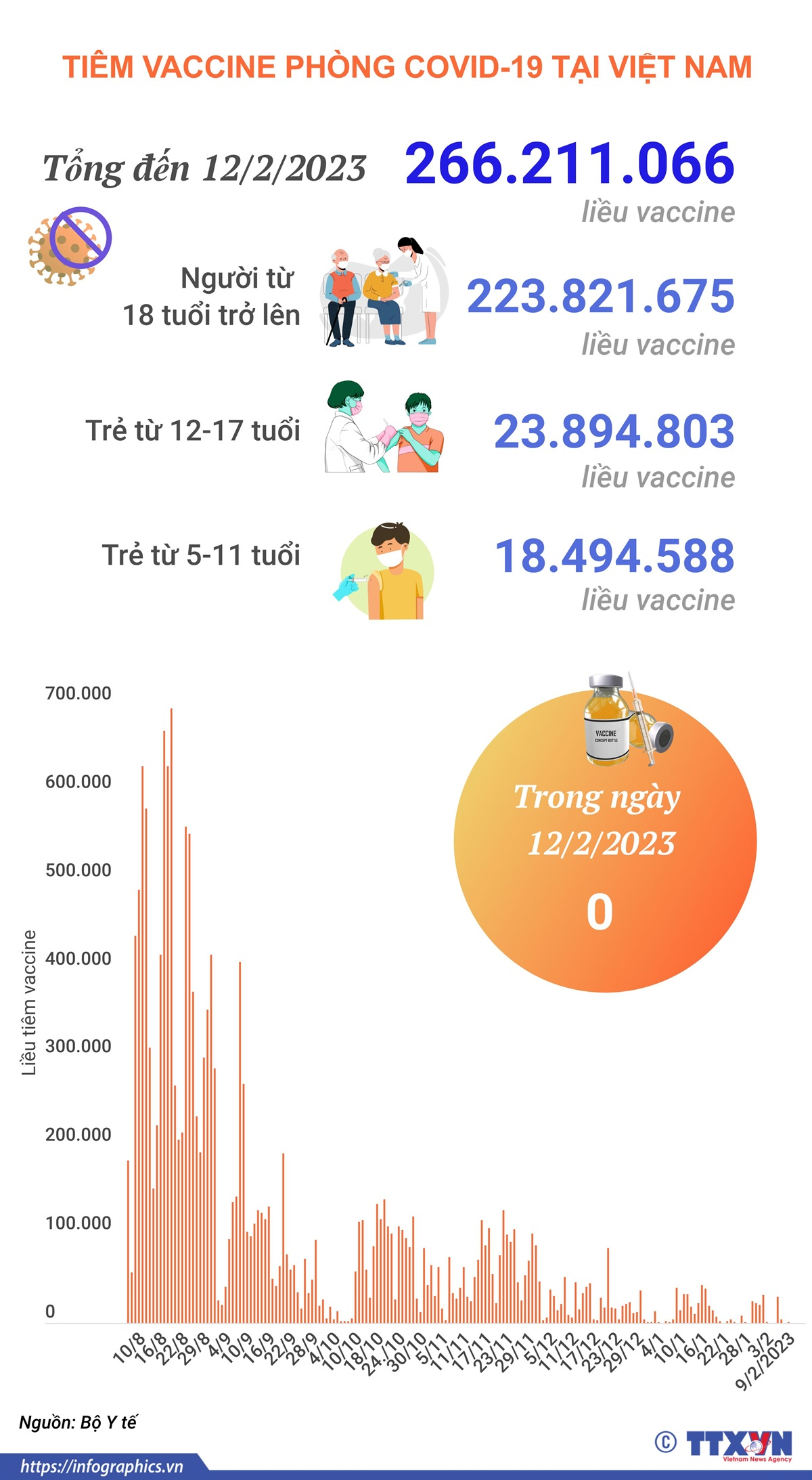 Đến ngày 12/2 tổng số liều vaccine đã được tiêm tại Việt Nam là 266.211.066 liều trong đó tiêm cho trẻ từ 5-11 tuổi là 18.494.588 liều, tiêm cho trẻ từ 12-17 tuổi là 23.894.803 liều và tiêm cho người từ 18 tuổi trở lên là 223.821.675 liều.
