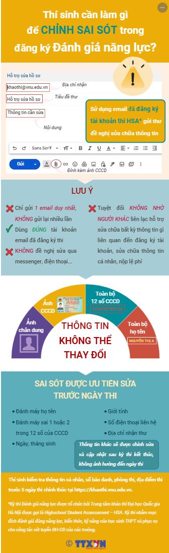 Trung tâm Khảo thí Đại học Quốc gia Hà Nội cho biết, một số thí sinh vẫn còn sai sót trong hồ sơ sau khi đăng ký ca thi Đánh giá năng lực HSA (Highschool Student Assessement) thành công. Đối với những hồ sơ cần chỉnh sửa, Trung tâm Khảo thí hướng dẫn thí sinh thực hiện theo như sau: Thí sinh sử dụng hòm thư điện tử (email) đã đăng ký tài khoản thi HSA gửi đề nghị sửa chữa thông tin kèm theo ảnh CCCD về địa chỉ: khaothi@vnu.edu.vn, tiêu đề "Hỗ trợ sửa hồ sơ"; Nói rõ thông tin cần sửa; Thí sinh chỉ gửi 1 email duy nhất và không gửi lại nhiều lần.