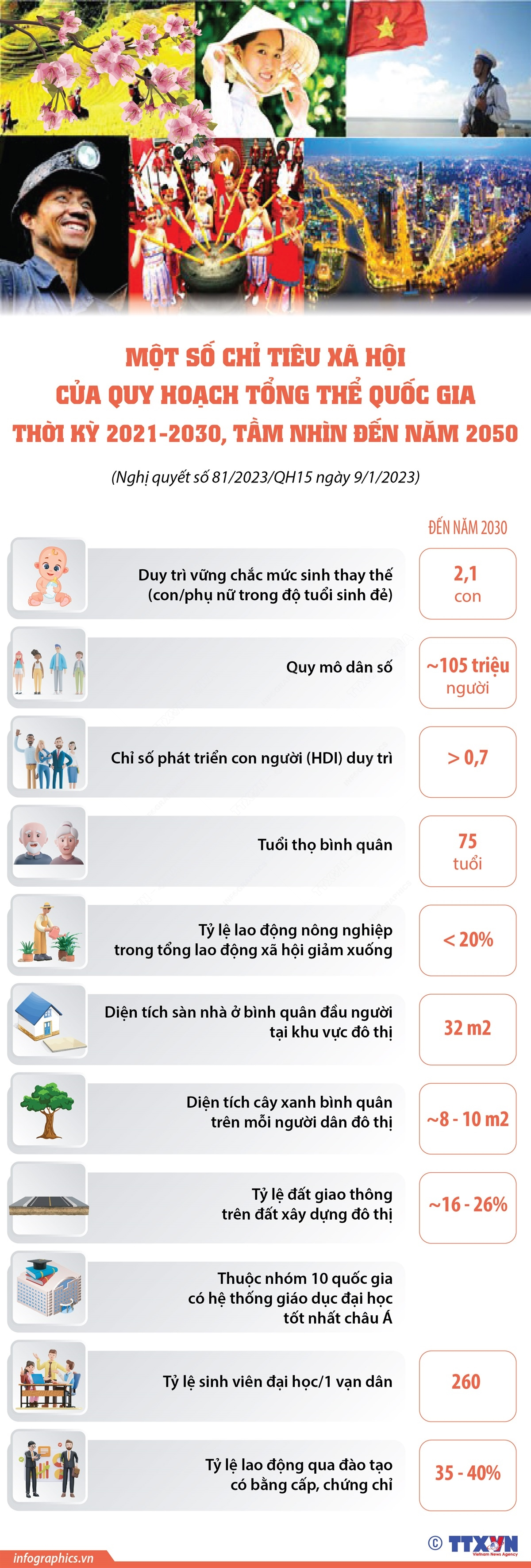 Theo Quy hoạch tổng thể quốc gia thời kỳ 2021-2030, tầm nhìn đến năm 2050, Việt Nam phấn đấu có tuổi thọ bình quân đạt 75 tuổi, trong đó thời gian sống khỏe mạnh đạt tối thiểu 68 năm. Tỷ lệ lao động nông nghiệp trong tổng lao động xã hội giảm xuống dưới 20%. Nâng cao chất lượng việc làm, giữ tỷ lệ thất nghiệp ở mức hợp lý. Phát triển nền giáo dục Việt Nam đạt trình độ tiên tiến trong khu vực thuộc nhóm 10 quốc gia có hệ thống giáo dục đại học tốt nhất châu Á. Nâng cao chất lượng dịch vụ y tế ngang tầm các nước tiên tiến trong khu vực...