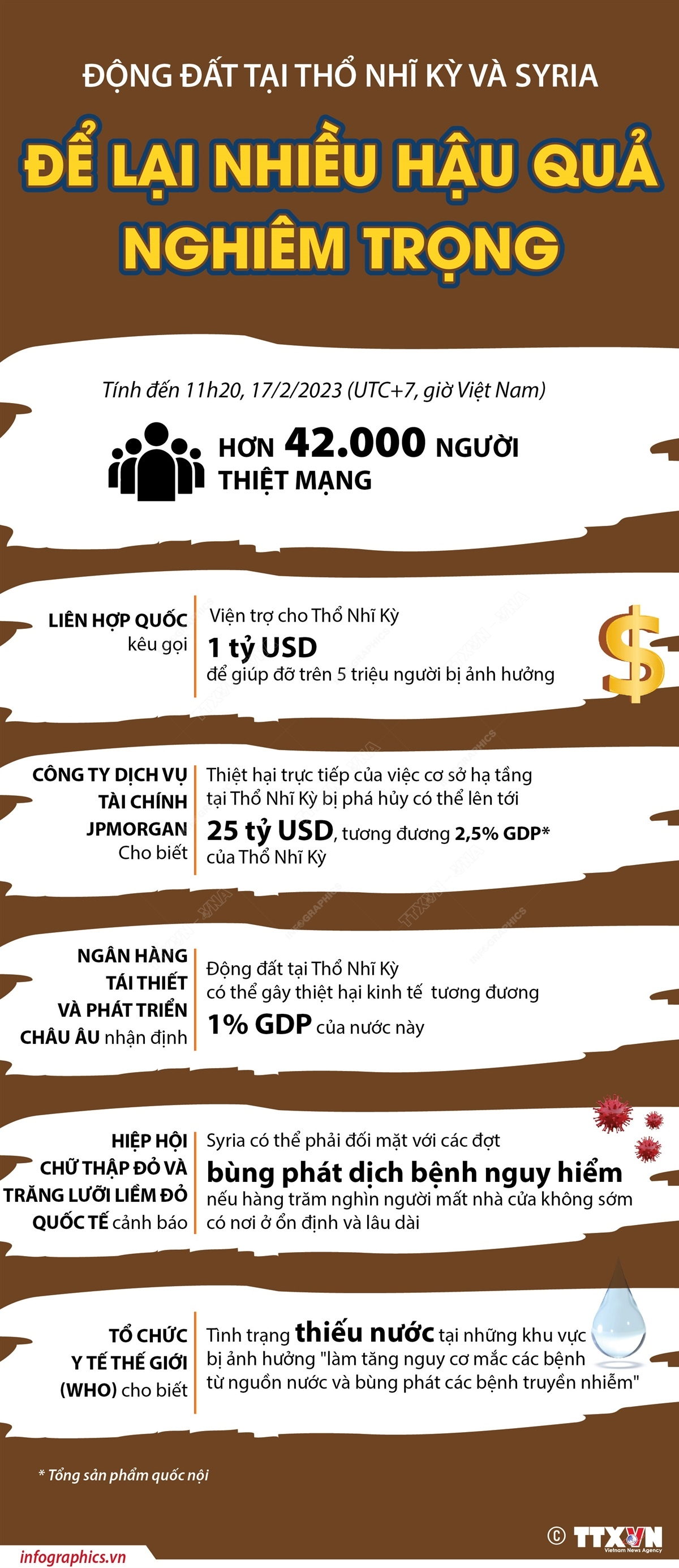 Tính đến 10 giờ 30 ngày 17/2/2023, thảm họa động đất kinh hoàng tại Thổ Nhĩ Kỳ và Syria hôm 6/2 đã cướp đi sinh mạng của hơn 42.000 người. Cộng đồng quốc tế đã thể hiện tinh thần đoàn kết khi tham gia giúp đỡ Thổ Nhĩ Kỳ khắc phục hậu quả trận động đất. Các tổ chức nhân đạo cũng đã triển khai hoạt động cứu trợ ở những khu vực bị ảnh hưởng nặng nề nhất.