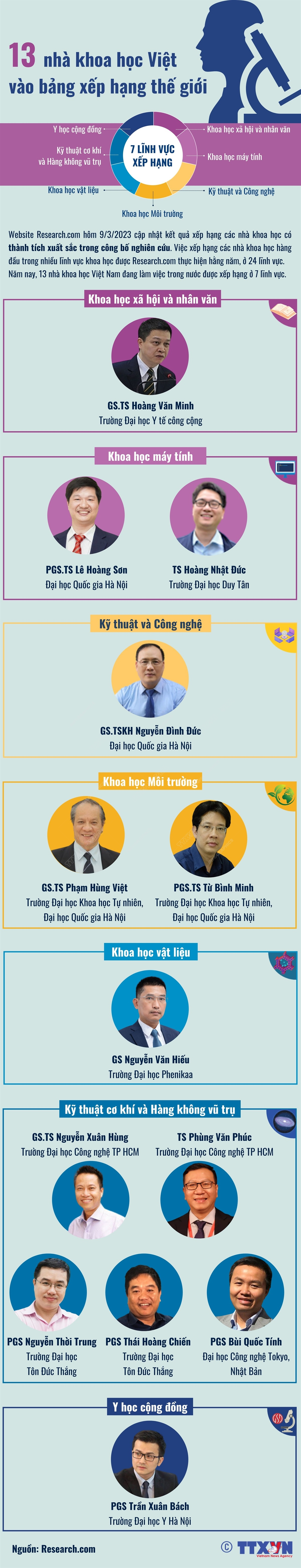 Website Research.com hôm 9/3/2023 cập nhật kết quả xếp hạng các nhà khoa học có thành tích xuất sắc trong công bố nghiên cứu. Việc xếp hạng các nhà khoa học hàng đầu trong nhiều lĩnh vực khoa học được Research.com thực hiện hằng năm, ở 24 lĩnh vực. Năm nay, 13 nhà khoa học Việt Nam đang làm việc trong nước được xếp hạng ở 7 lĩnh vực.
