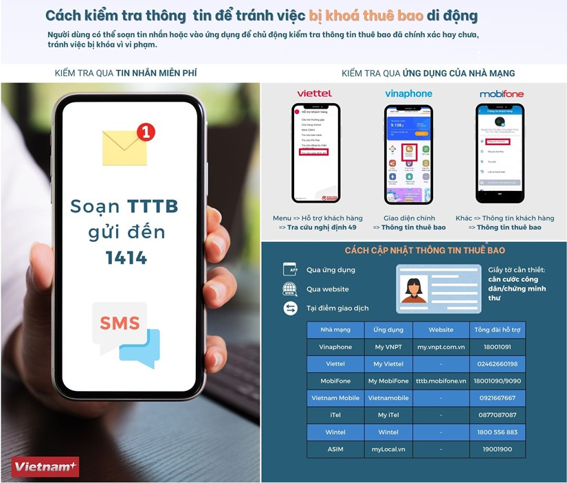 Người dùng có thể soạn tin nhắn TTTB gửi đến 1414 hoặc vào ứng dụng nhà mạng để kiểm tra thông tin thuê bao đã chính xác hay chưa, tranh việc bị khóa vì vi phạm.