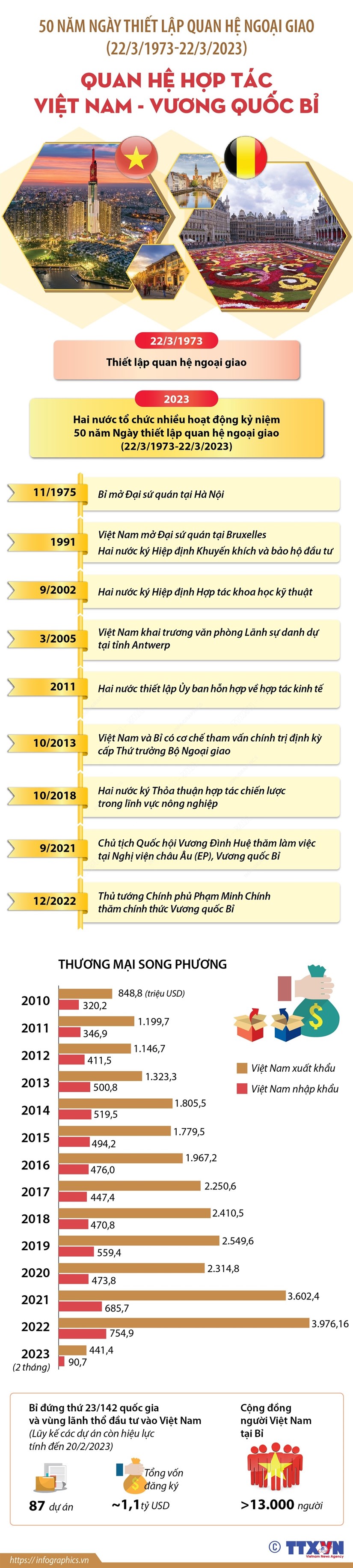 Vương quốc Bỉ hiện là đối tác thương mại lớn thứ 6 của Việt Nam tại EU và có nhiều dự án đầu tư ở Việt Nam, chủ yếu trong các lĩnh vực logistics và phát triển hạ tầng.