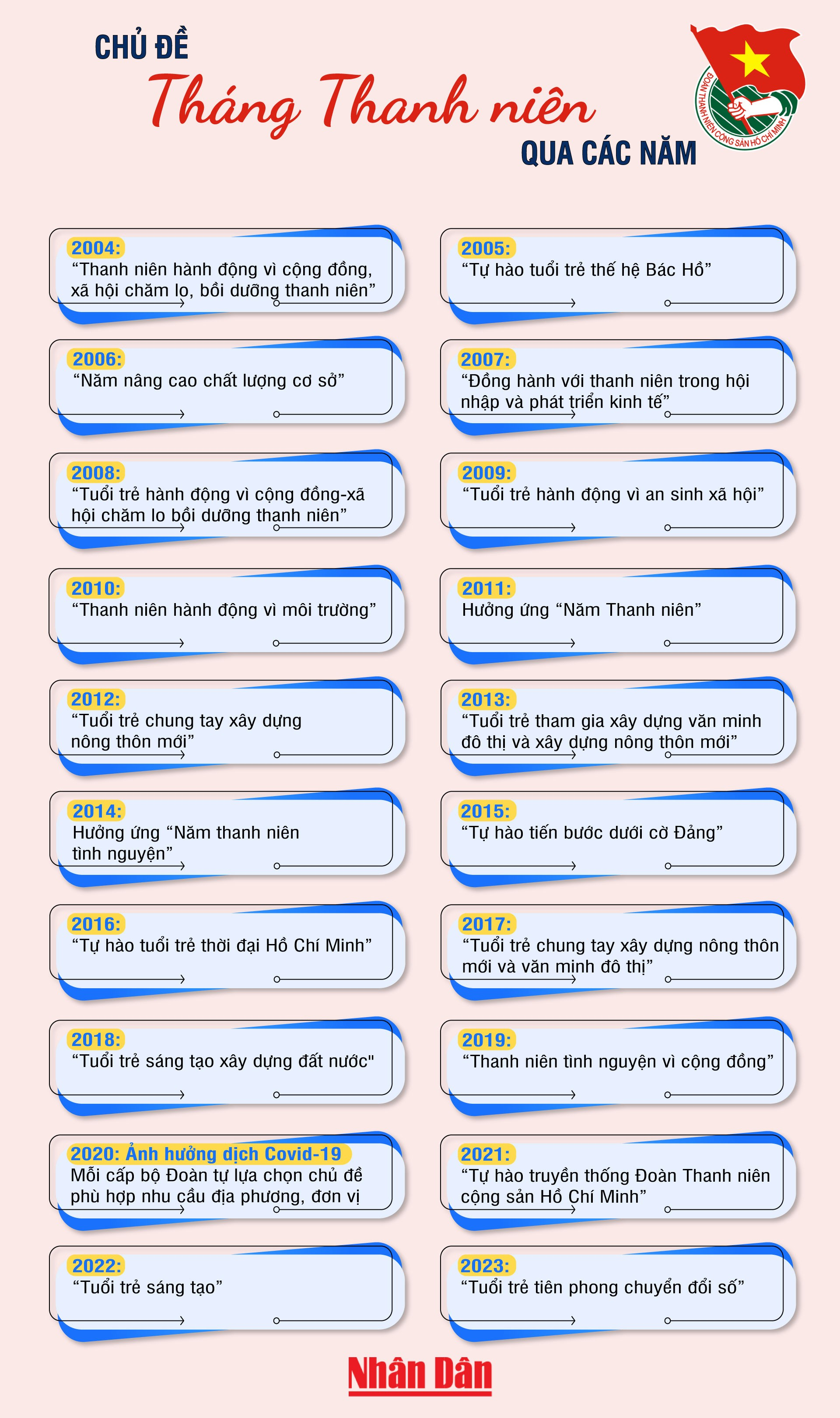 Kể từ khi được chính thức phát động vào năm 2004, ngoại trừ năm 2020 do ảnh hưởng của dịch Covid-19, mỗi năm Ban Bí thư Trung ương Đoàn Thanh niên Cộng sản Hồ Chí Minh đều lựa chọn chủ đề hoạt động cho Tháng Thanh niên.