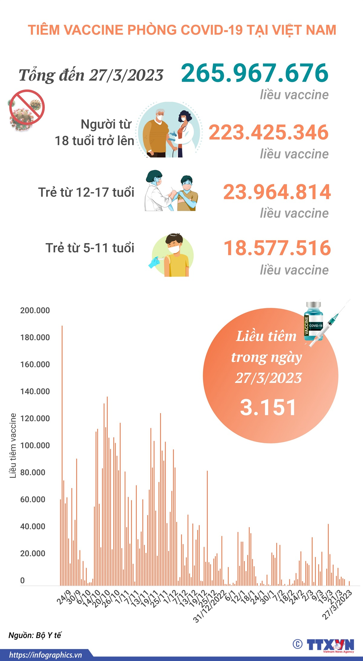 Trong ngày 27/3/2023 có 3.151 liều vaccine phòng COVID-19 được tiêm. Như vậy, tổng số liều vaccine đã được tiêm tại Việt Nam là 265.967.676 liều trong đó tiêm cho trẻ từ 5-11 tuổi là 18.577.516 liều, tiêm cho trẻ từ 12-17 tuổi là 23.964.814 liều và tiêm cho người từ 18 tuổi trở lên là 223.425.346 liều.