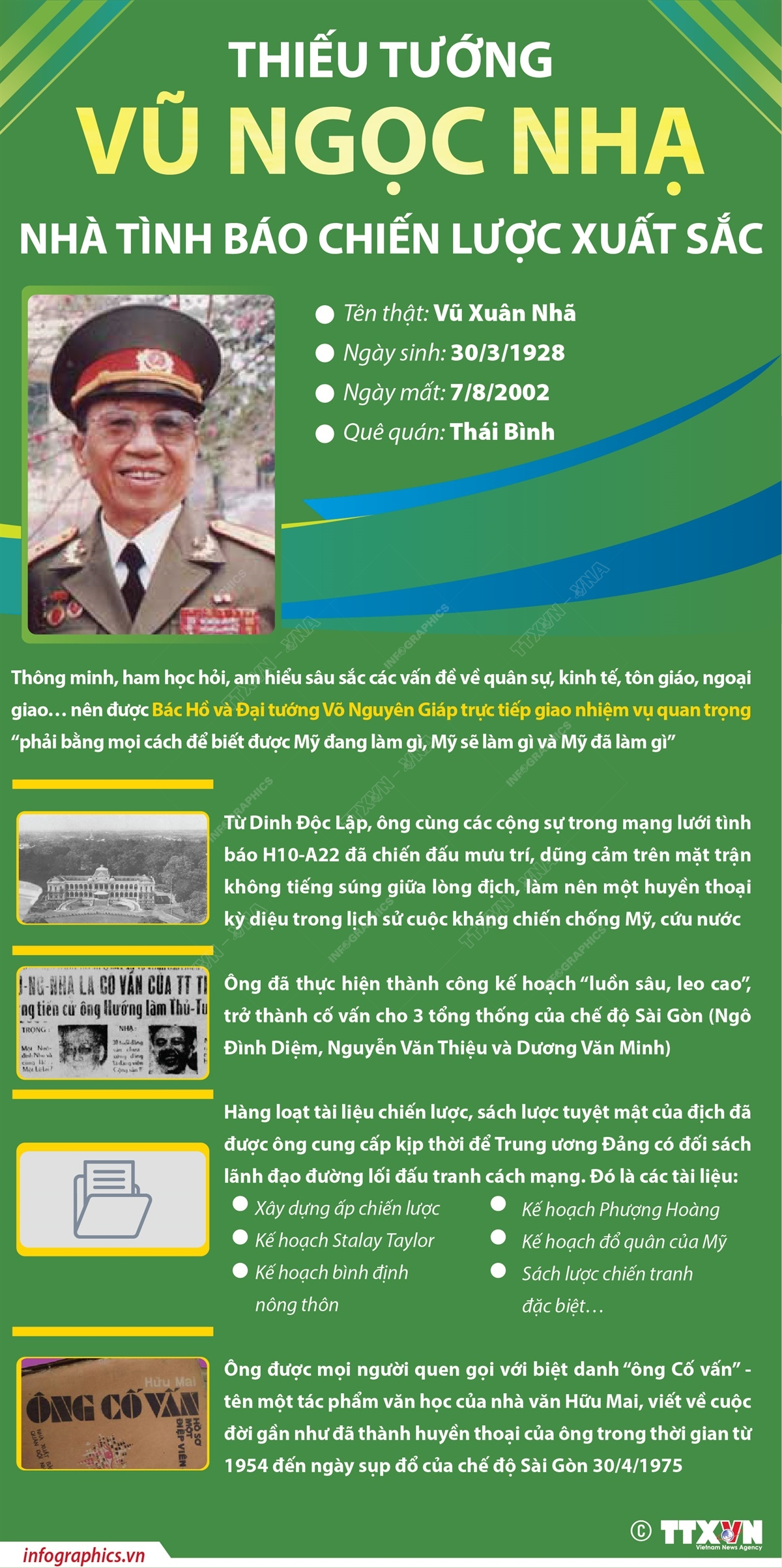 Trong cuộc đấu tranh giải phóng dân tộc, thống nhất đất nước, chiến trường không chỉ diễn ra ngoài mặt trận mà còn diễn ra ngay trong lòng địch - nơi những chiến sĩ tình báo xuất sắc nhất của quân đội nhân dân Việt Nam lặng lẽ lập những chiến công. Thiếu tướng tình báo Vũ Ngọc Nhạ - người từng làm cố vấn cho 3 tổng thống của chế độ Sài Gòn - là một trong số đó. Ông cùng các cộng sự trong mạng lưới tình báo H10-A22 đã chiến đấu mưu trí, dũng cảm trên mặt trận không tiếng súng giữa lòng địch, làm nên một huyền thoại kỳ diệu trong lịch sử cuộc kháng chiến chống Mỹ, cứu nước của dân tộc. Thiếu tướng tình báo Vũ Ngọc Nhạ sinh ngày 30/3/1928, cách đây 95 năm.