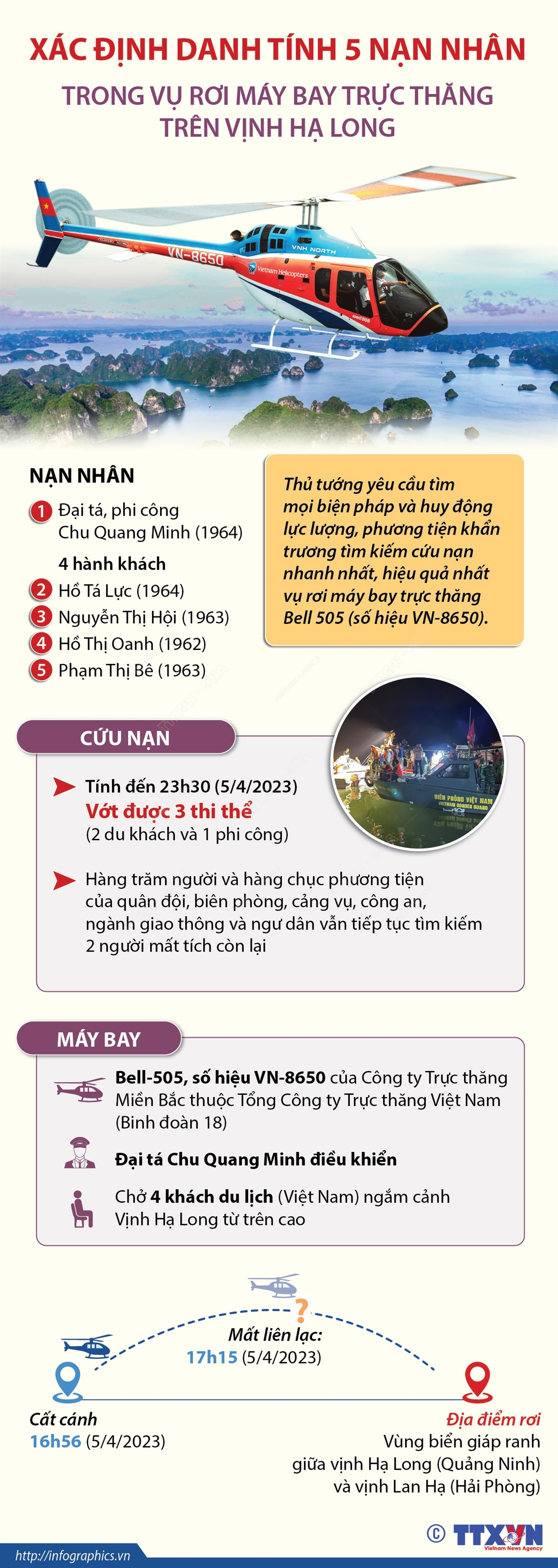Rạng sáng ngày 6/4/2023, các lực lượng chức năng đã vớt được 3 thi thể (2 du khách và 1 phi công) trong số 5 nạn nhân trong vụ tai nạn máy bay Bell-505, số hiệu VN-8650 của Công ty Trực thăng Miền Bắc thuộc Tổng Công ty Trực thăng Việt Nam (Binh đoàn 18) rơi chiều 5/4/2023. Tại Công điện số 221/CĐ-TTg ngày 5/4/2023, Thủ tướng Chính phủ yêu cầu: Bộ Quốc phòng chủ trì, phối hợp với Bộ Công an và các bộ, cơ quan, địa phương liên quan tập trung tìm mọi biện pháp và huy động lực lượng, phương tiện khẩn trương tìm kiếm cứu nạn nhanh nhất, hiệu quả nhất.