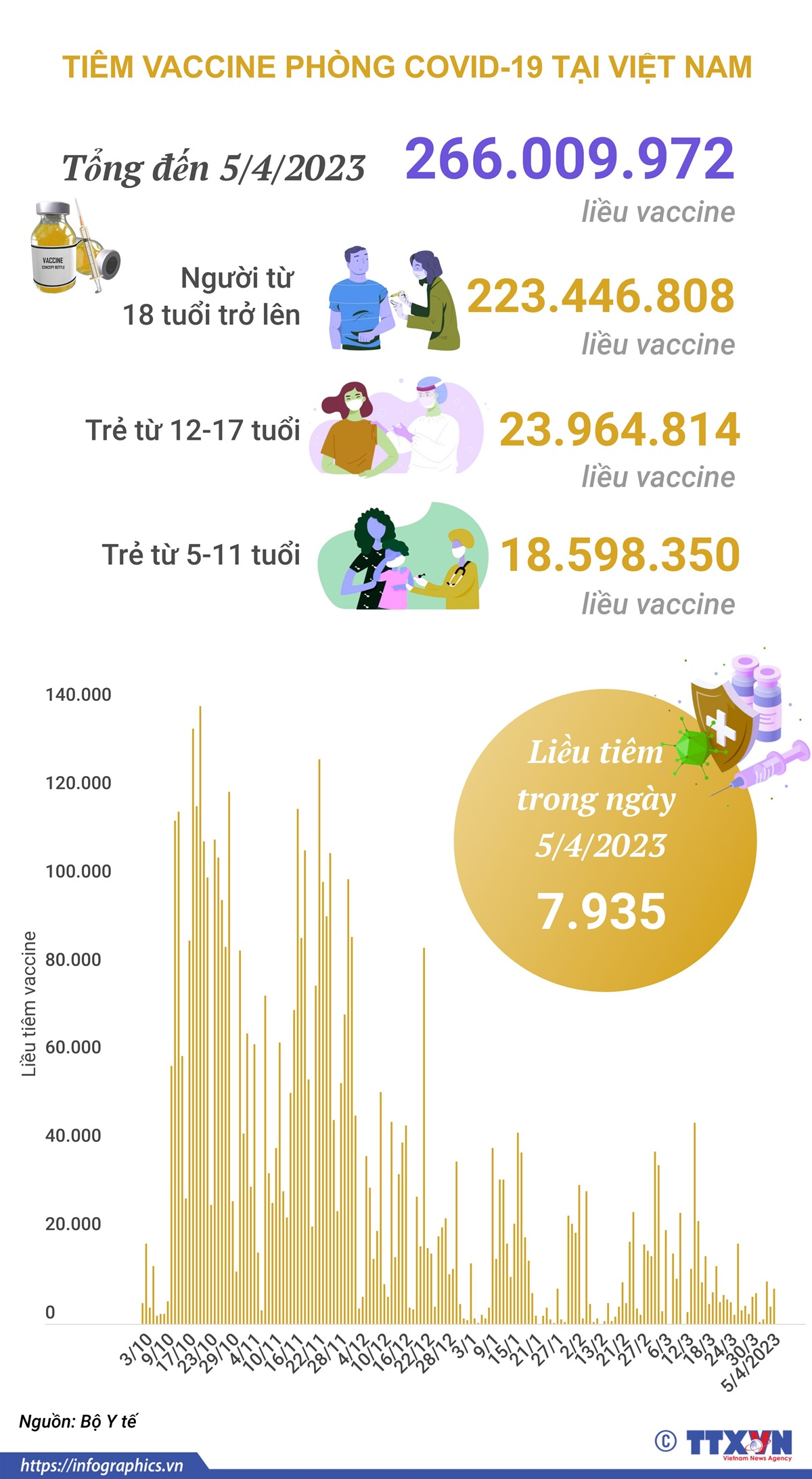 Trong ngày 5/4/2023 có 7.935 liều vaccine phòng COVID-19 được tiêm. Như vậy, tổng số liều vaccine đã được tiêm tại Việt Nam là 266.009.972 liều trong đó tiêm cho trẻ từ 5-11 tuổi là 18.598.350 liều, tiêm cho trẻ từ 12-17 tuổi là 23.964.814 liều và tiêm cho người từ 18 tuổi trở lên là 223.446.808 liều.