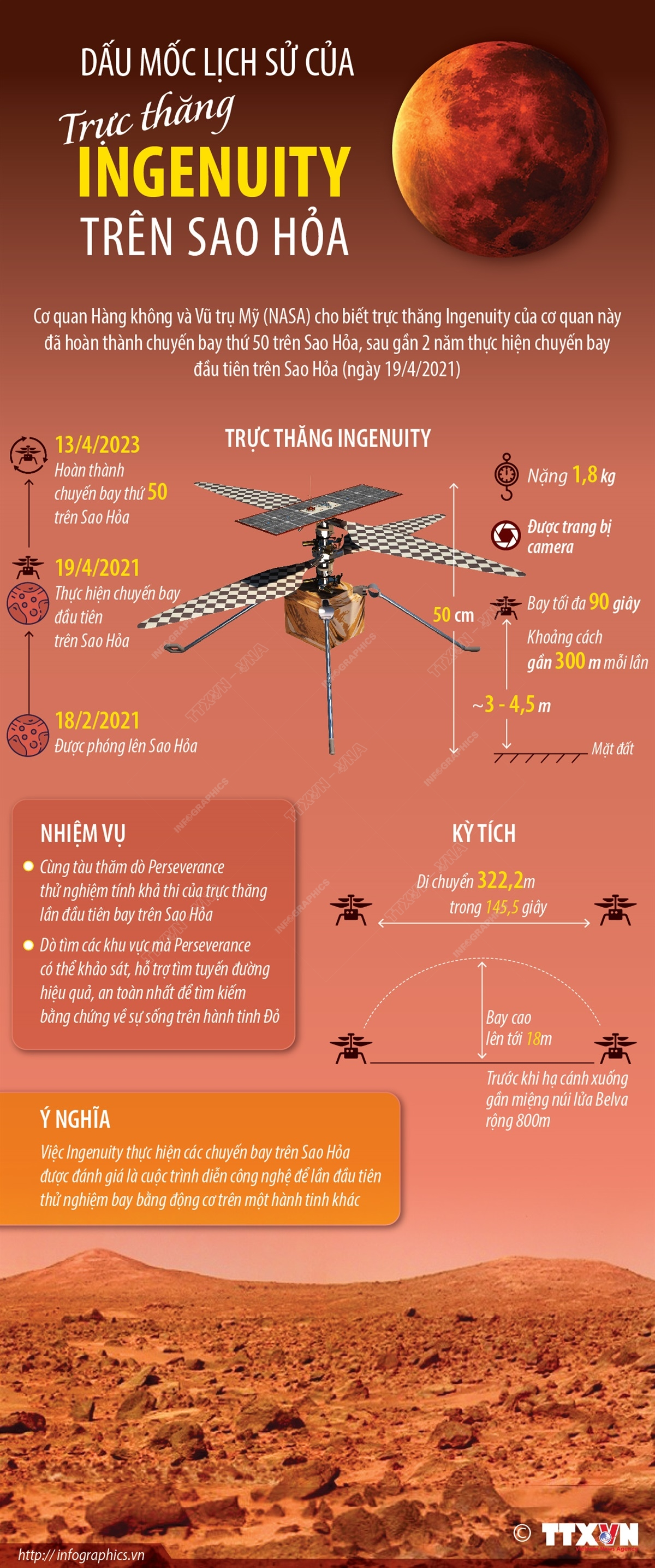 Cơ quan Hàng không và Vũ trụ Mỹ (NASA) cho biết, trực thăng Ingenuity của cơ quan này đã hoàn thành chuyến bay thứ 50 trên Sao Hỏa, sau gần 2 năm thực hiện chuyến bay đầu tiên tại đây (vào ngày 19/4/2021).