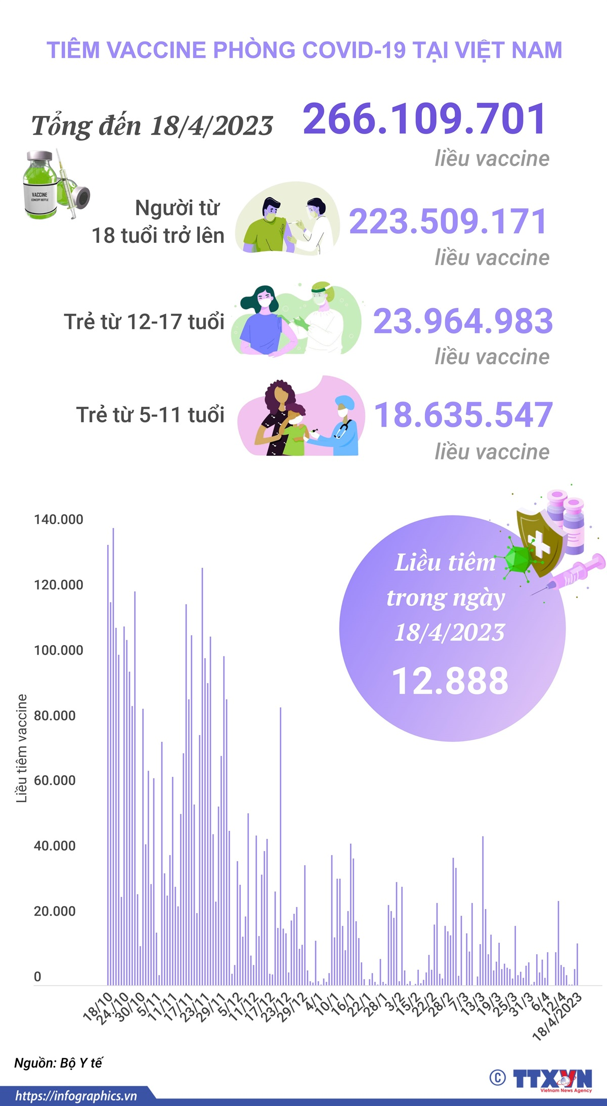 Trong ngày 18/4/2023 có 12.888 liều vaccine phòng COVID-19 được tiêm. Như vậy, tổng số liều vaccine đã được tiêm tại Việt Nam là 266.109.701 liều trong đó tiêm cho trẻ từ 5-11 tuổi là 18.635.547 liều, tiêm cho trẻ từ 12-17 tuổi là 23.964.983 liều và tiêm cho người từ 18 tuổi trở lên là 223.509.171 liều.