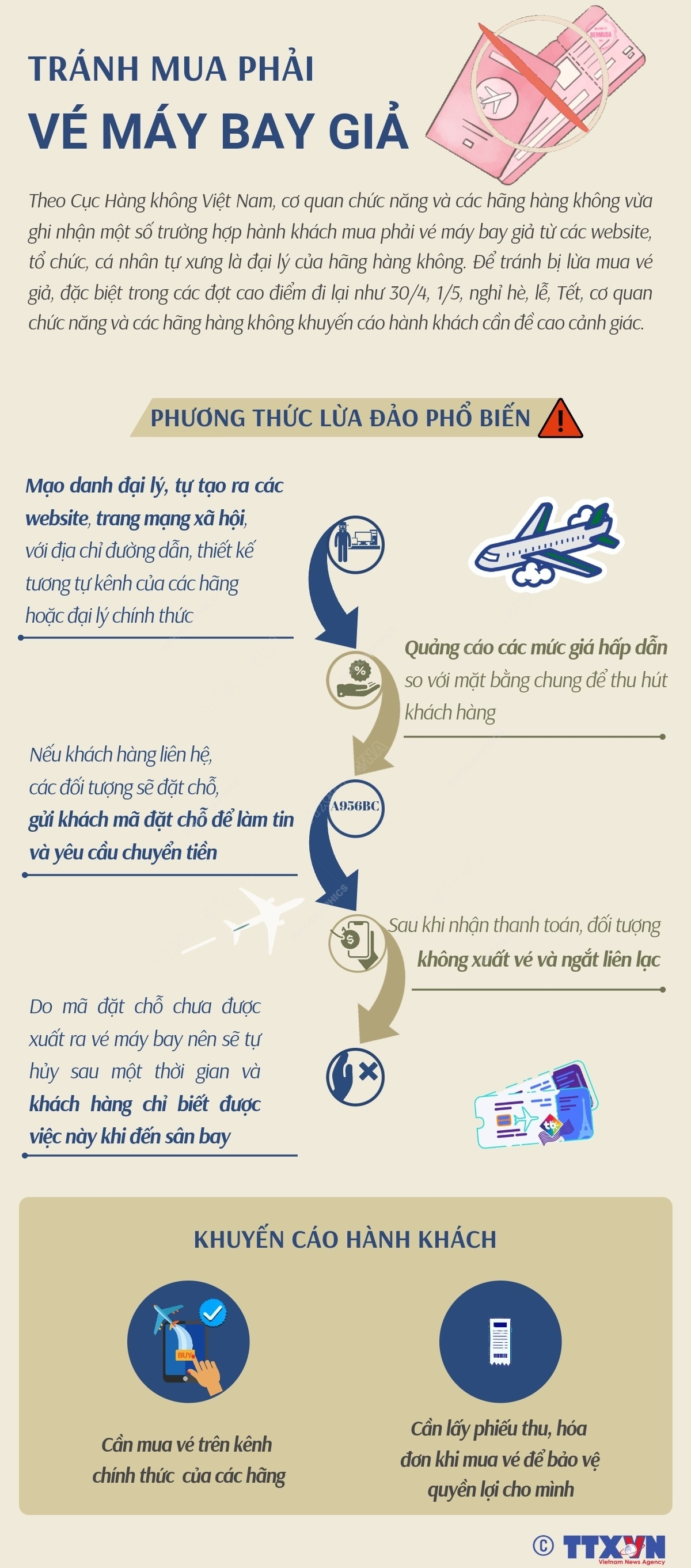 Theo Cục Hàng không Việt Nam, cơ quan chức năng và các hãng hàng không vừa ghi nhận một số trường hợp hành khách mua phải vé máy bay giả từ các website, tổ chức, cá nhân tự xưng là đại lý của hãng hàng không. Để tránh bị lừa mua vé giả, đặc biệt trong các đợt cao điểm đi lại như 30/4, 1/5, nghỉ hè, lễ, Tết, cơ quan chức năng và các hãng hàng không khuyến cáo hành khách cần đề cao cảnh giác.