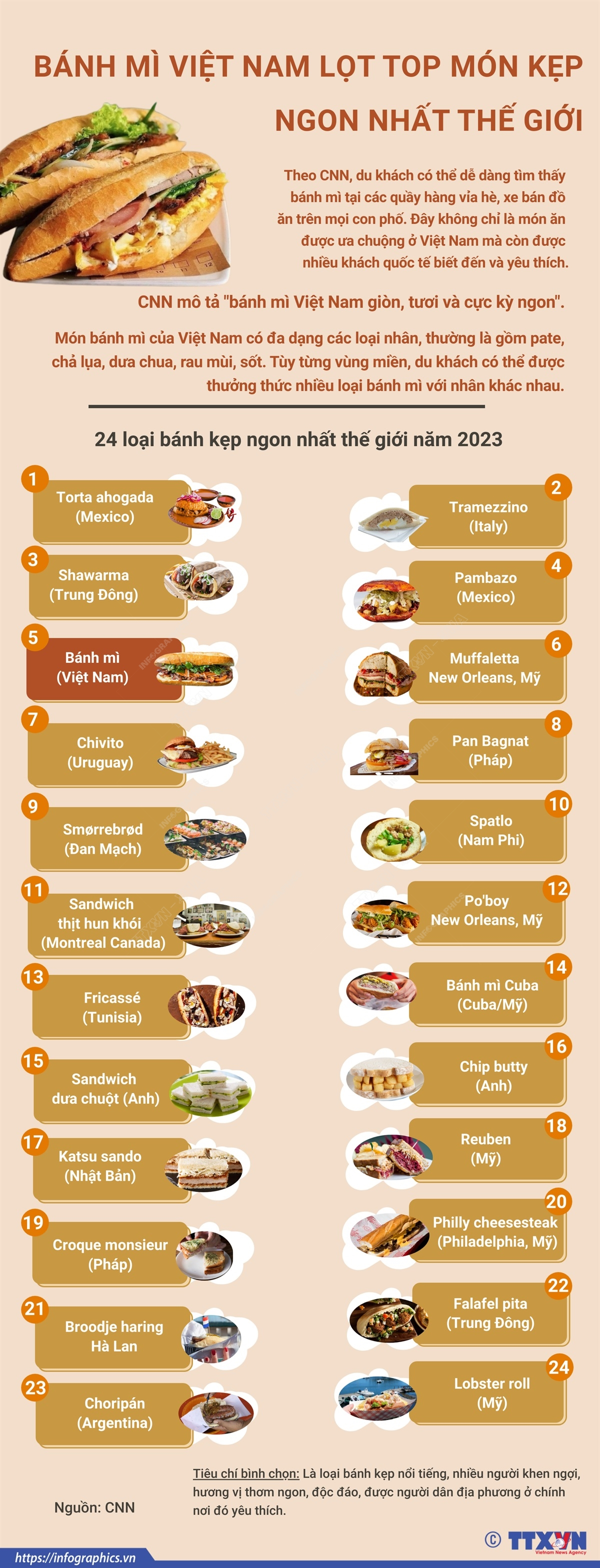 Món bánh mì Việt Nam vừa lọt danh sách 24 món bánh kẹp ngon nhất thế giới năm 2023 do CNN bình chọn và công bố. Theo CNN, du khách có thể dễ dàng tìm thấy bánh mì tại các quầy hàng vỉa hè, xe bán đồ ăn trên mọi con phố. Đây không chỉ là món ăn được ưa chuộng trong nước mà còn được nhiều khách quốc tế biết đến và yêu thích. CNN mô tả "bánh mì Việt Nam giòn, tươi và cực kỳ ngon". Món bánh mì của Việt Nam đa dạng các loại nhân, thường là gồm pate, chả lụa, dưa chua, rau mùi, sốt. Tùy từng vùng miền, du khách có thể được thưởng thức nhiều loại bánh mì với nhân khác nhau.