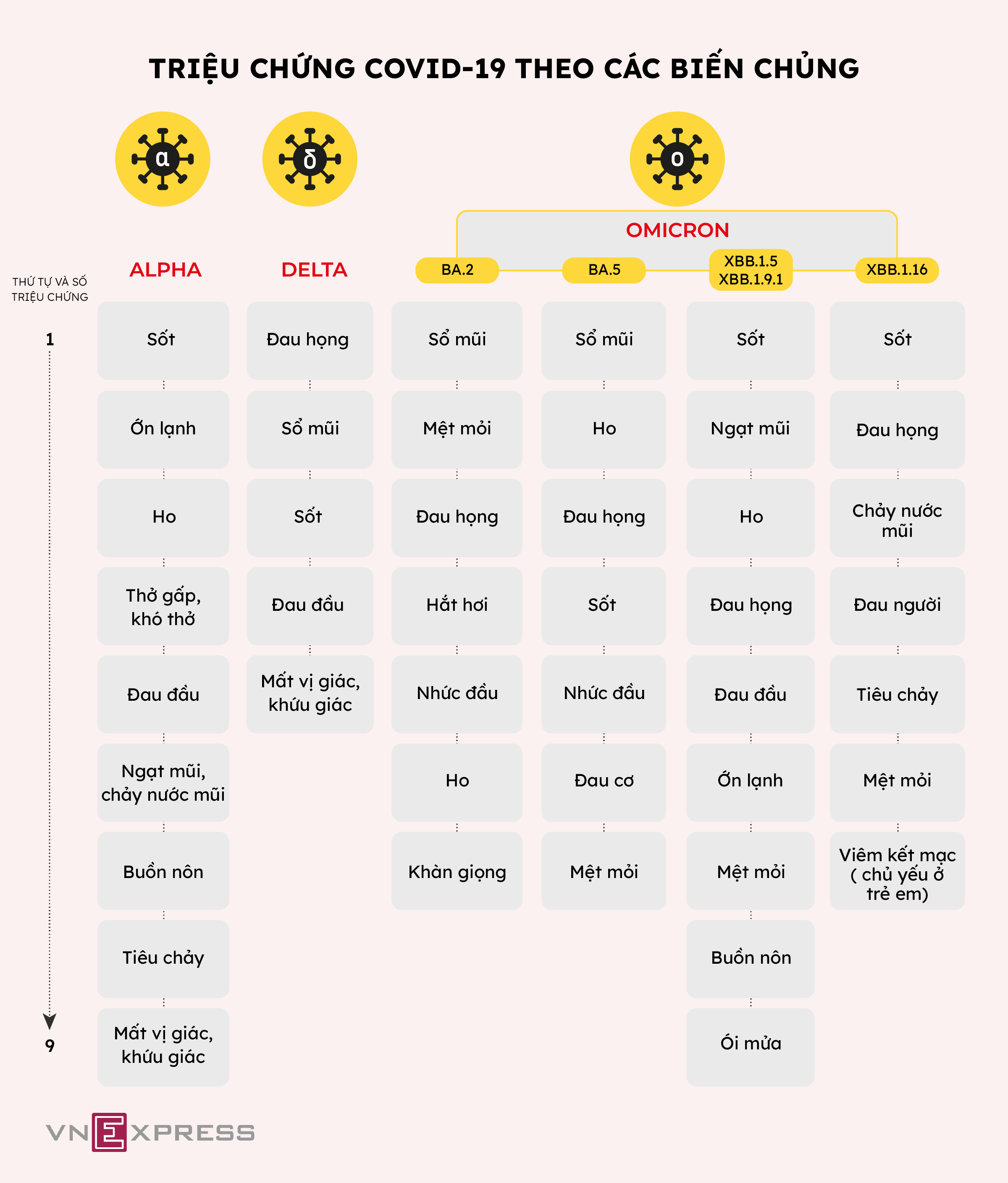 Các biến chủng phụ của Omicron đang chiếm ưu thế trên thế giới, gồm nhóm XBB triệu chứng phổ biến là sốt, ho, đau họng và một số người đau mắt; nhóm BA thường gây sổ mũi, đau họng.