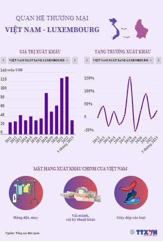 Trong những năm qua, quan hệ thương mại giữa Việt Nam và Luxembourg đã có những bước phát triển tích cực. Năm 2022, tổng kim ngạch thương mại song phương tăng 3,1% so với năm 2021, đạt 187,11 triệu USD. Tính riêng 3 tháng đầu năm 2023, thương mại song phương đạt 42,45 triệu USD, bằng 22,7% của cả năm 2022.