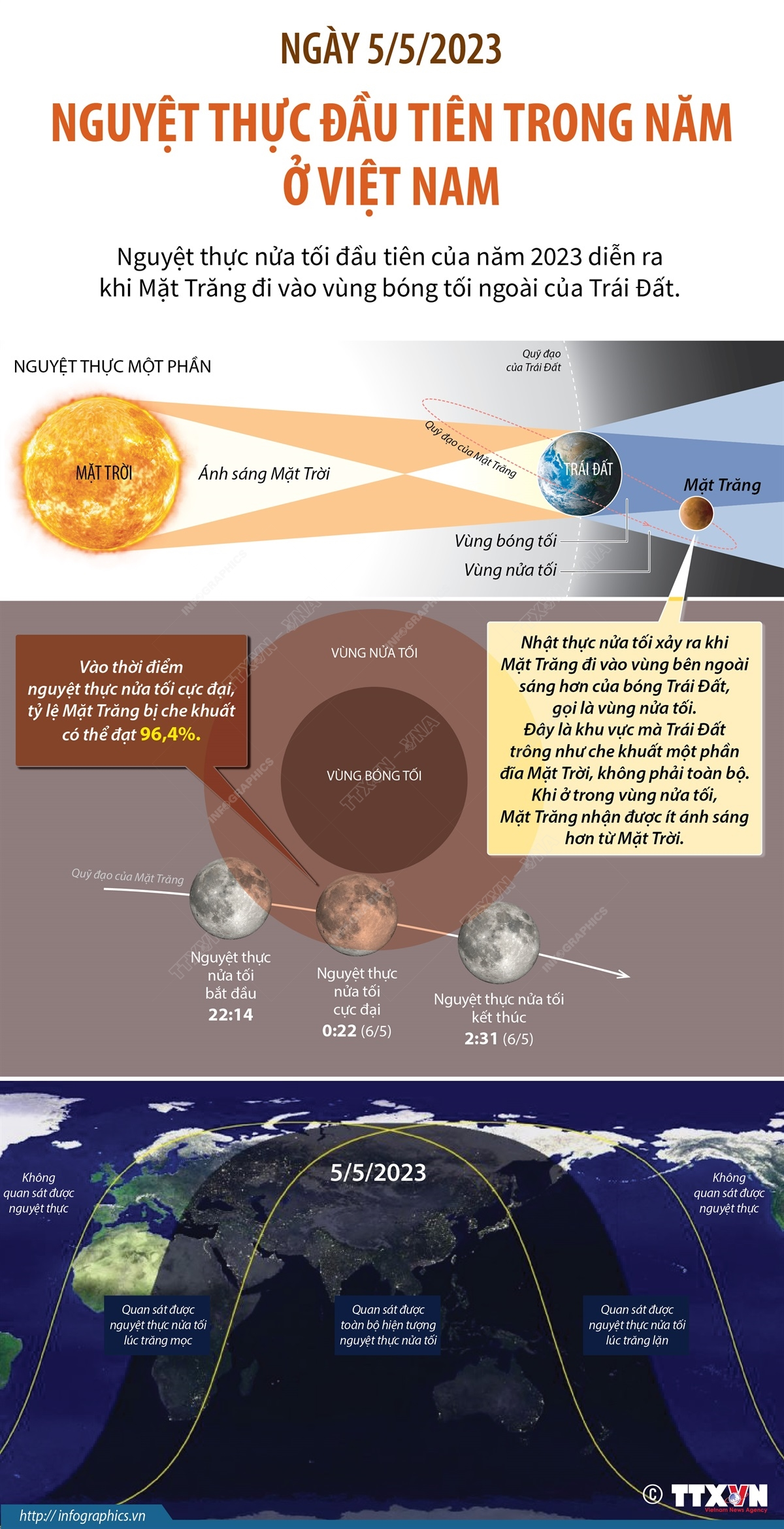 Đêm 5 và rạng sáng ngày 6/5/2023, người yêu thiên văn tại Việt Nam sẽ có cơ hội quan sát "nguyệt thực nửa tối", một hiện tượng quang học đáng chú ý trong năm 2023. Theo giờ Hà Nội, "nguyệt thực nửa tối" sẽ bắt đầu lúc 22h14' ngày 5/5/2023, đạt cực đại với tỷ lệ đi vào vùng nửa tối là 96,4% lúc 0h23' ngày 6/5/2023 và kết thúc lúc 2h31' cùng ngày. Bất cứ nơi nào ở Việt Nam (cũng như hầu hết châu Á, châu Âu, châu Phi và châu Đại Dương) đều có thể quan sát hiện tượng "nguyệt thực nửa tối" này.