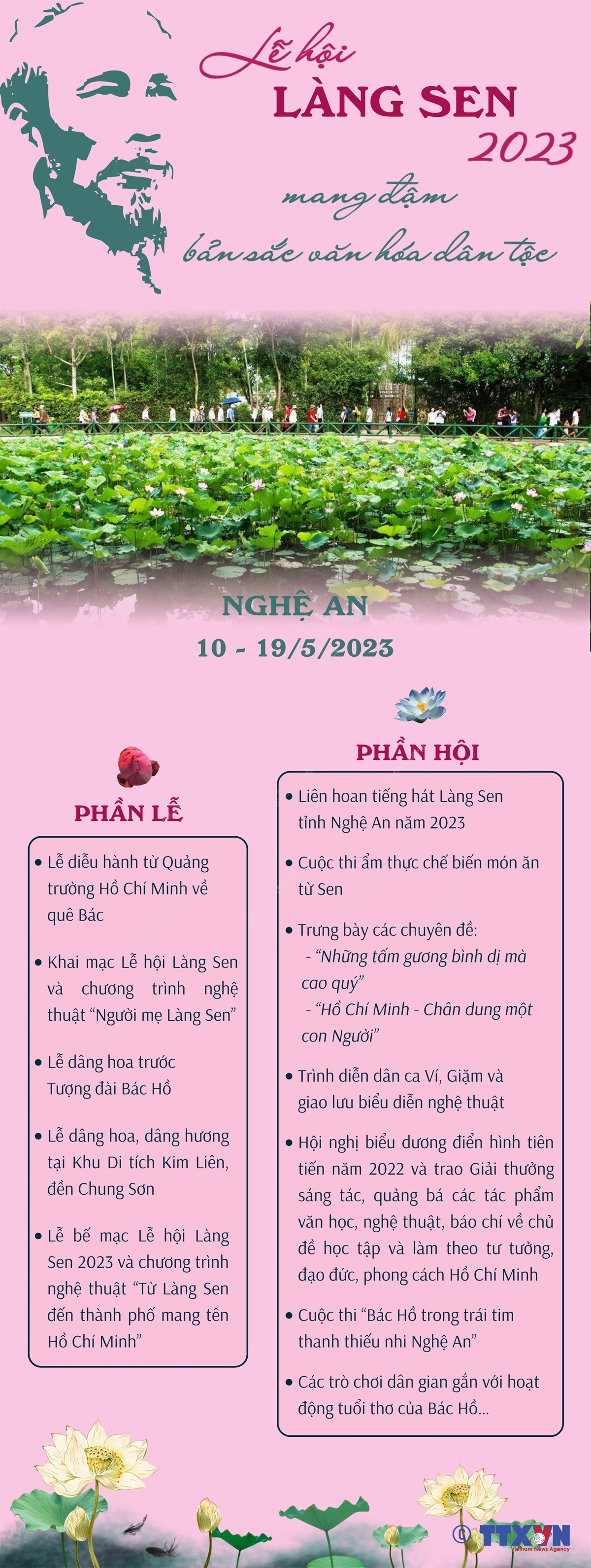 Lễ hội Làng Sen năm 2023 diễn ra từ ngày 10 - 19/5/2023 tại Nghệ An với nhiều hoạt động ý nghĩa nhân kỷ niệm 133 năm Ngày sinh Chủ tịch Hồ Chí Minh (19/5/1890 - 19/5/2023). Đây là hoạt động chính trị, văn hóa có ý nghĩa quan trọng, thể hiện lòng biết ơn, thành kính của nhân dân đối với Chủ tịch Hồ Chí Minh; tuyên truyền, giáo dục tư tưởng Hồ Chí Minh; tiếp tục thực hiện học tập và làm theo tư tưởng, đạo đức, phong cách Hồ Chí Minh; giới thiệu, quảng bá về văn hóa Làng Sen, quê hương Chủ tịch Hồ Chí Minh tới bạn bè, du khách trong và ngoài nước.