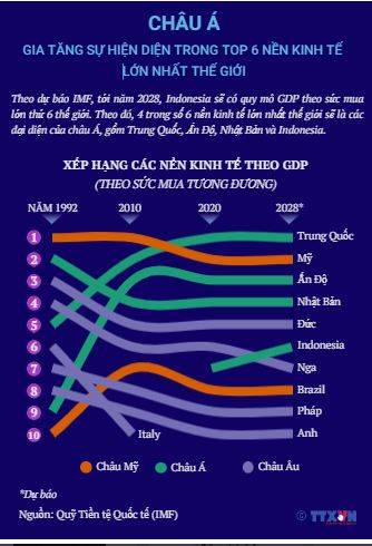 Theo dự báo IMF, tới năm 2028, Indonesia sẽ có quy mô GDP theo sức mua lớn thứ 6 thế giới. Theo đó, 4 trong số 6 nền kinh tế lớn nhất thế giới s ẽ là các đại diện của châu Á, gồm Trung Quốc, Ấn Độ, Nhật Bản và Indonesia.