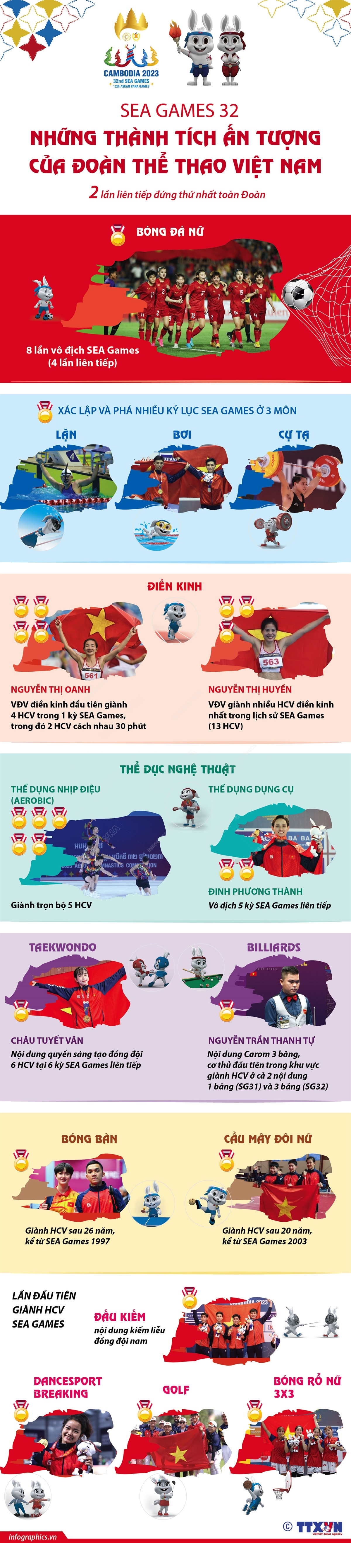 Đoàn Thể thao Việt Nam đã khép lại SEA Games 32 với thành tích 136 Huy chương Vàng, 105 Huy chương Bạc và 114 Huy chương Đồng, xếp thứ nhất toàn đoàn. Đây là lần đầu tiên Thể thao Việt Nam xếp thứ nhất toàn đoàn trong một kỳ SEA Games không phải là nước chủ nhà và là lần thứ 3 đứng đầu bảng tổng sắp SEA Games. Tại SEA Games 32, các vận động viên đã giành được nhiều thành tích ấn tượng.