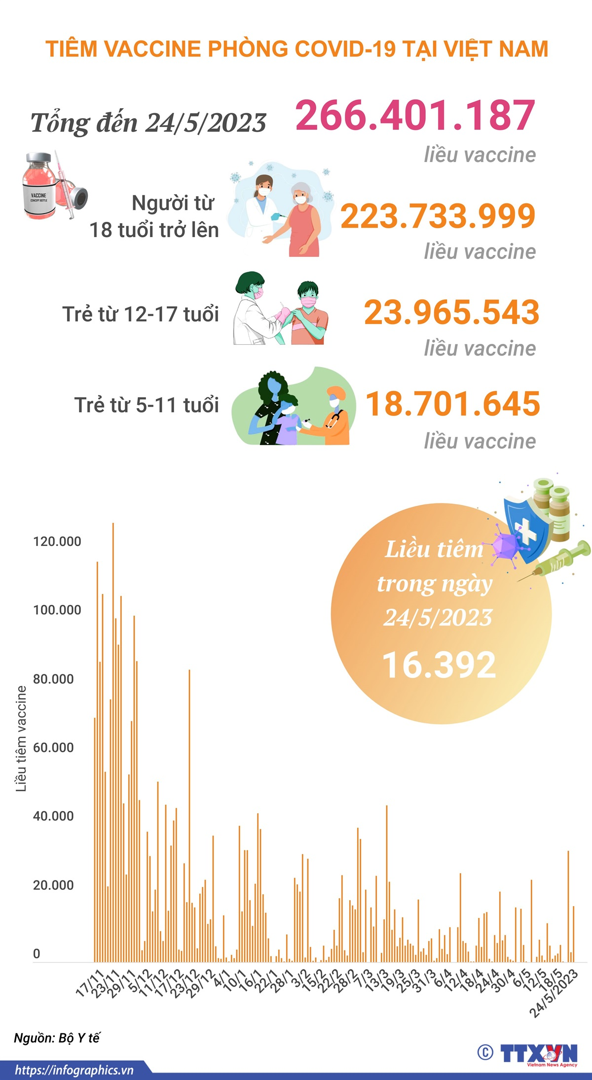 Trong ngày 24/5/2023 có 16.392 liều vaccine phòng COVID-19 được tiêm. Như vậy, tổng số liều vaccine đã được tiêm tại Việt Nam là 266.401.187 liều trong đó tiêm cho trẻ từ 5-11 tuổi là 18.701.645 liều, tiêm cho trẻ từ 12-17 tuổi là 23.965.543 liều và tiêm cho người từ 18 tuổi trở lên là 223.733.999 liều.