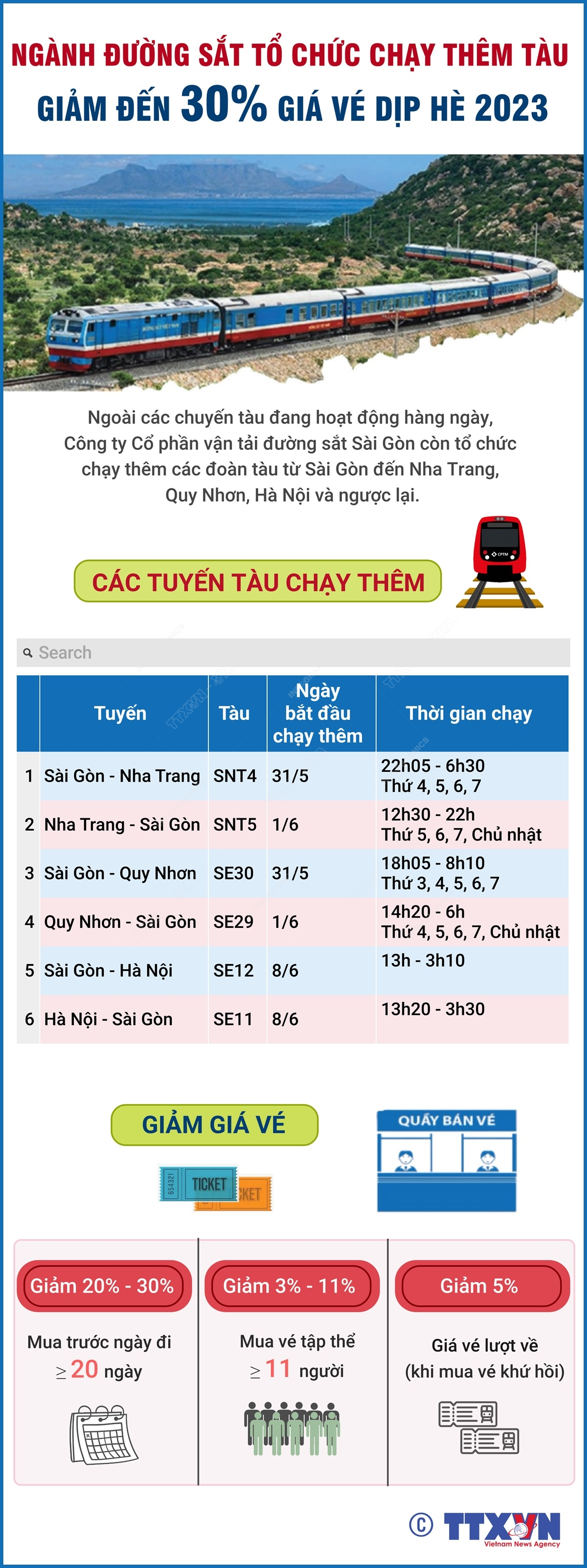 Để đáp ứng nhu cầu đi lại của hành khách vào dịp Hè 2023, ngoài các chuyến tàu đang hoạt động hàng ngày, Công ty Cổ phần vận tải đường sắt Sài Gòn còn tổ chức chạy thêm các đoàn tàu từ Sài Gòn đến Nha Trang, Quy Nhơn, Hà Nội và ngược lại. Công ty cũng áp dụng nhiều chương trình giảm giá lên đến 30% dịp này.