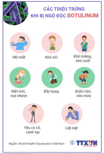 Các triệu chứng ngộ độc Botulinum thường xuất hiện từ 4 giờ đến 8 ngày sau khi ăn phải thức ăn nhiễm độc tố. Các triệu chứng phổ biến gồm mệt mỏi, suy nhược, chóng mặt (mất thăng bằng), thường đi kèm mờ mắt, khô miệng, khó nuốt, nôn, thậm chí liệt mặt.