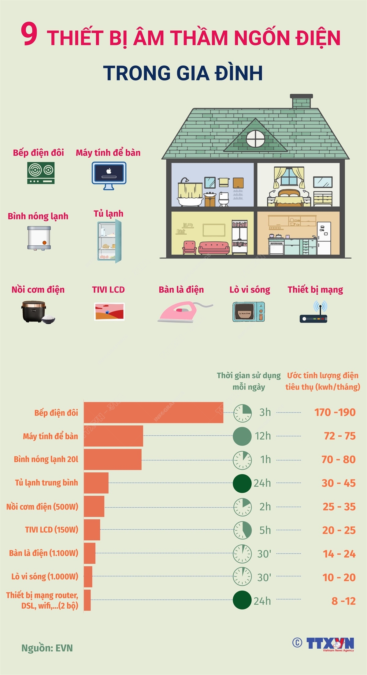 Những thiết bị công suất không lớn nhưng thường xuyên được sử dụng như máy tính, tivi, bếp điện... đang âm thầm ngốn điện của các hộ gia đình. Để tiết kiệm điện năng cũng như giảm chi phí tiền điện, cần lưu ý sử dụng các thiết bị này một cách hợp lý.