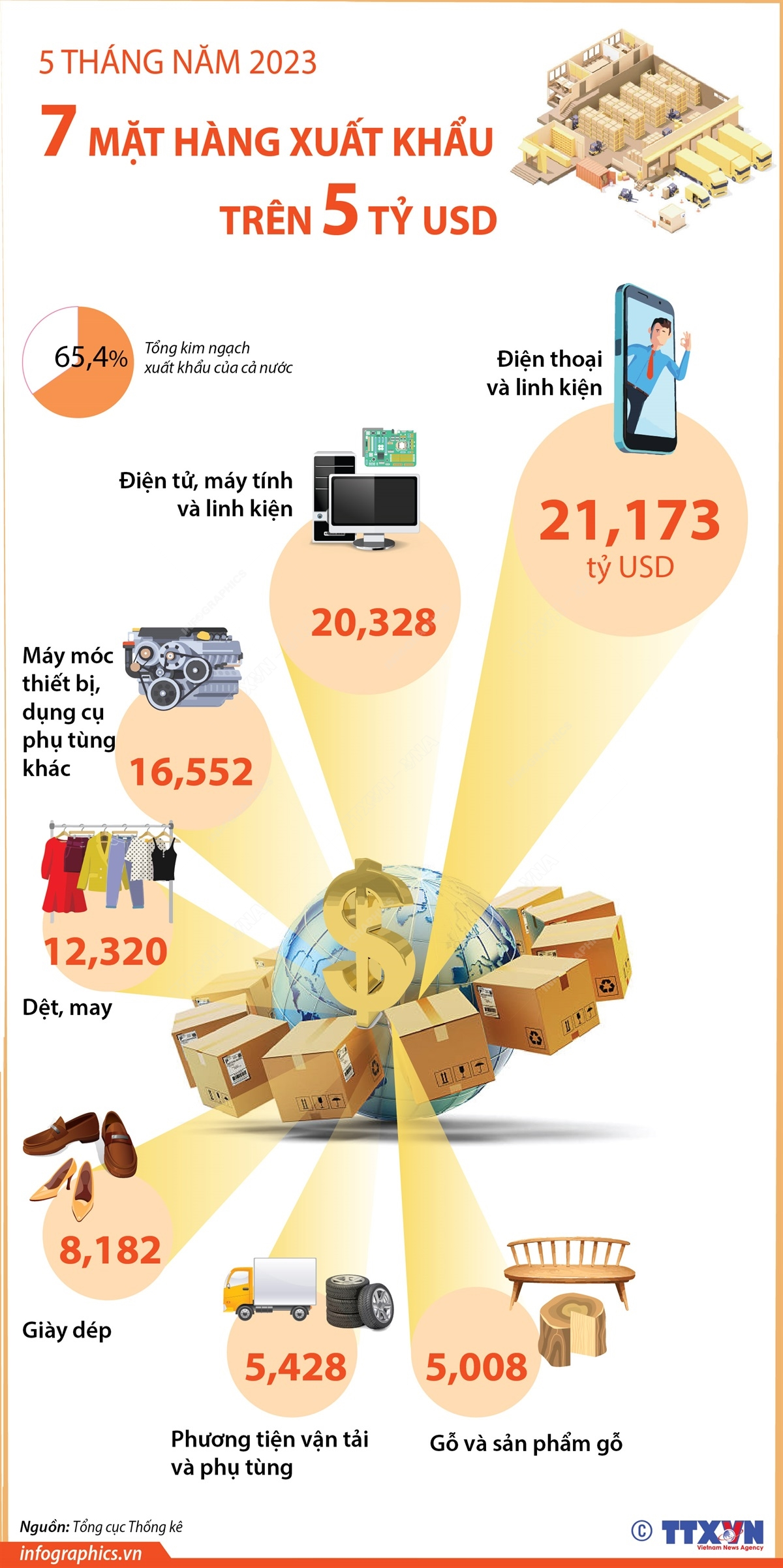 5 tháng năm 2023, có 7 mặt hàng xuất khẩu trên 5 tỷ USD, chiếm 65,4% tổng kim ngạch xuất khẩu của cả nước.
